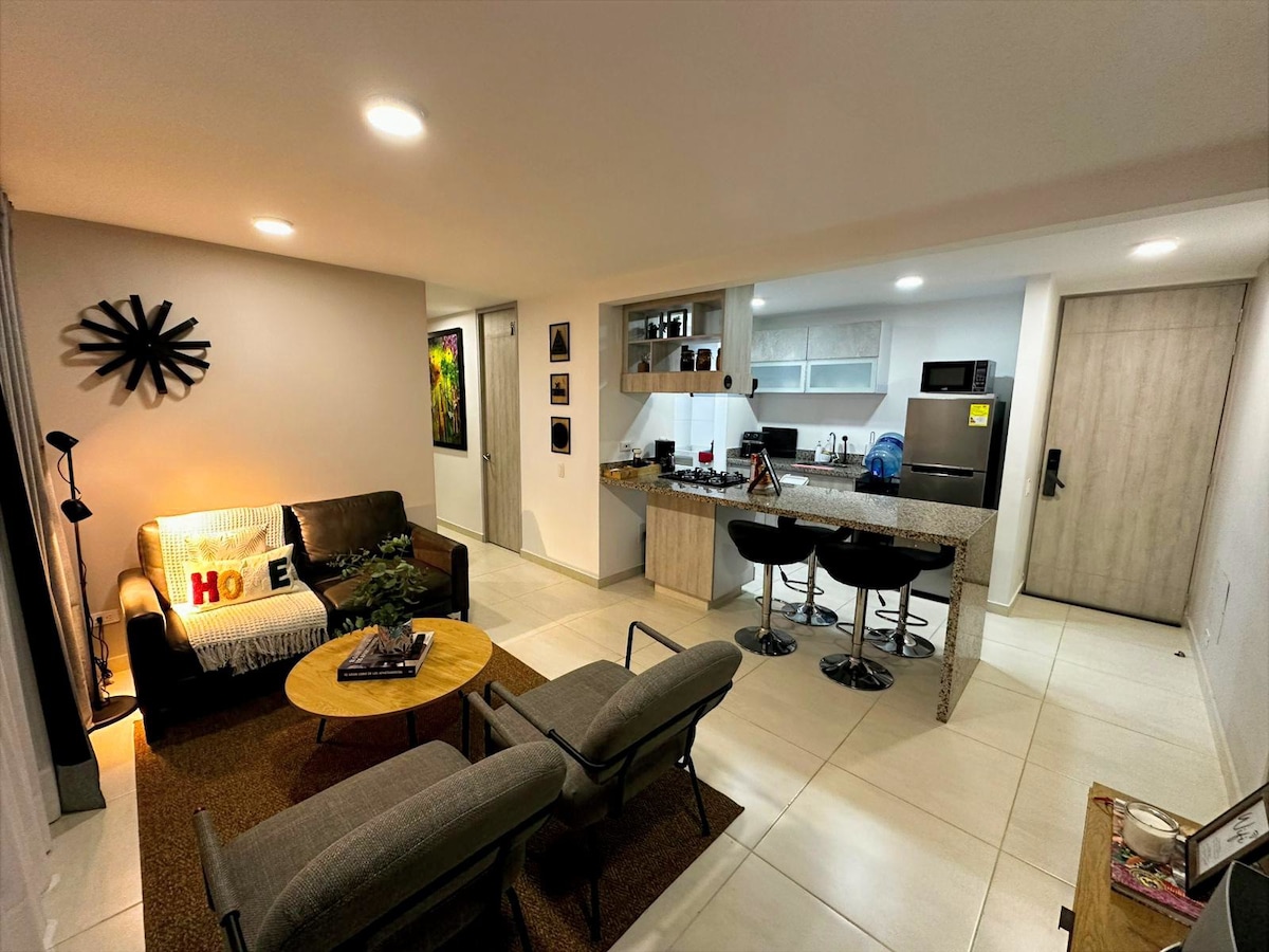 Apartamento acogedor en Chia, rodeado de naturaleza, con entrada privada, sala y cocina con un diseño vanguardista amplio y cómodo. Parquedero gratuito, ingreso independiente, privacidad. El Apto tiene todas las comodidades para que pases un noche magnifica, calentador de ambiente para que no sientas frío y Netflix incluido. Estamos a 2 minutos de la subida a la iglesia de la Valvanera y a 5 minitos del centro de Chia. Llegan todos los domicilios y hay supermercado cerca.