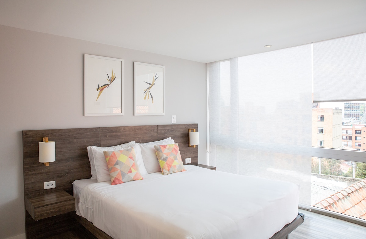 Enjoy a peaceful stay in this charming Bogota studio. It features a double bed and a foldable bed, a private bathroom with a dedicated walk-in shower, and a fully equipped open-plan kitchen to make you feel at home. Includes a private washer-dryer, a dining table for four, and all necessary utensils. Guests have access to premium common areas such as a coworking space, gym, dining zone, billiards, ping-pong, jacuzzi, and a beautiful event lounge. Just a few minutes’ walk from Parque 93