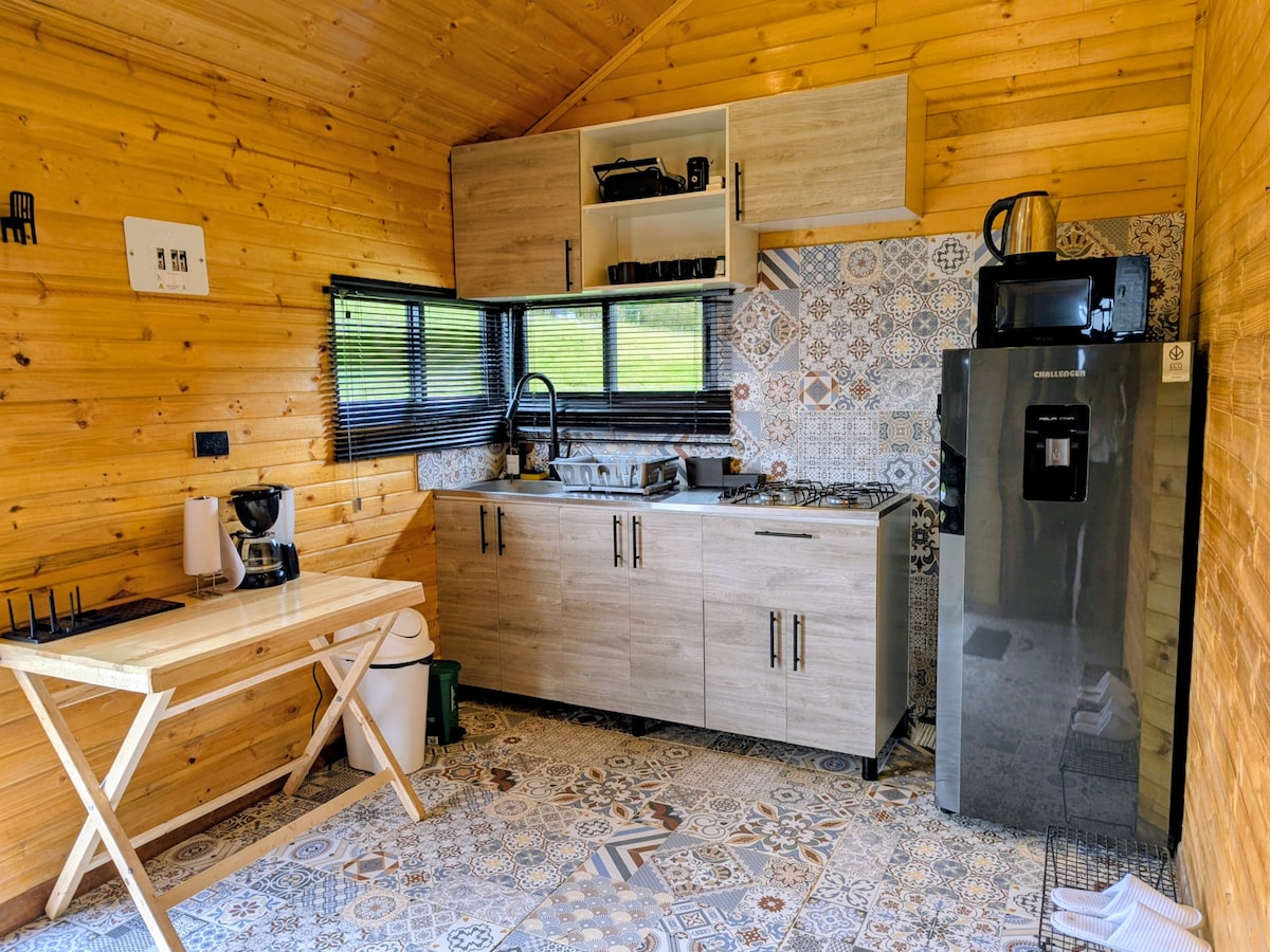 Este Chalet se encuentra en la finca Amarelo, en una de las veredas más lindas de Suesca, es totalmente pavimentado hasta la entrada de la finca, cuenta con una habitación, sofá cama en la sala, cocina equipada, sala, chimenea, terraza. Puede utilizar las instalaciones de la finca. El Jacuzzi deben reservarlo con anterioridad y no está incluido en el precio, se le reserva solo a una cabaña por día, y es de uso exclusivo.