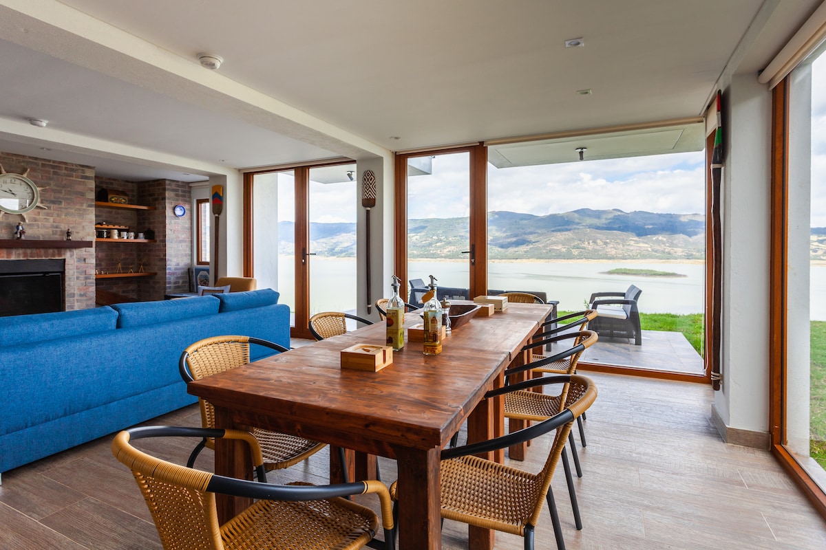 Vista D' Amore, a 60 km. de Bogotá, tiene una vista espectacular de la represa de Tominé. Está diseñada con mucha luz y espacio para disfrutar y relajarse. Los cuartos tienen cada uno con su baño para mayor privacidad. Cuenta con wifi, lavavajillas, lavadora y secadora de ropa. La casa es silenciosa con ventanería doble. Las habitaciones tienen acceso a balcón o terraza. Por las noches comparte alrededor de la chimenea.