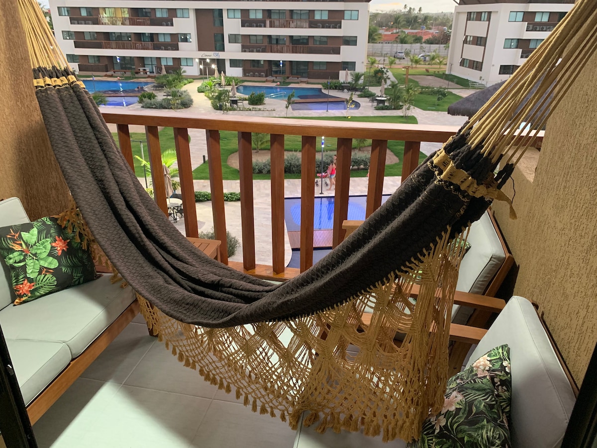 Cupe Beach Living, condomínio clube à beira mar (pé na areia), 22 piscinas, restaurante , quadra de tênis , futebol, brinquedoteca, parquinho, academia, pista de bike, Restaurante no local, loja de conveniência, cadeiras na praia e guarda sol . À 4 km do centrinho de Porto. O apartamento: - Varanda com vista para o mar e piscinas (nascente, não bate sol da tarde na varanda). -Sala com SmarTV , sofá e ar condicionado. -2 Quartos (1 suíte) com SmartTV, ar cond. -Cozinha completa. -Wi-Fi