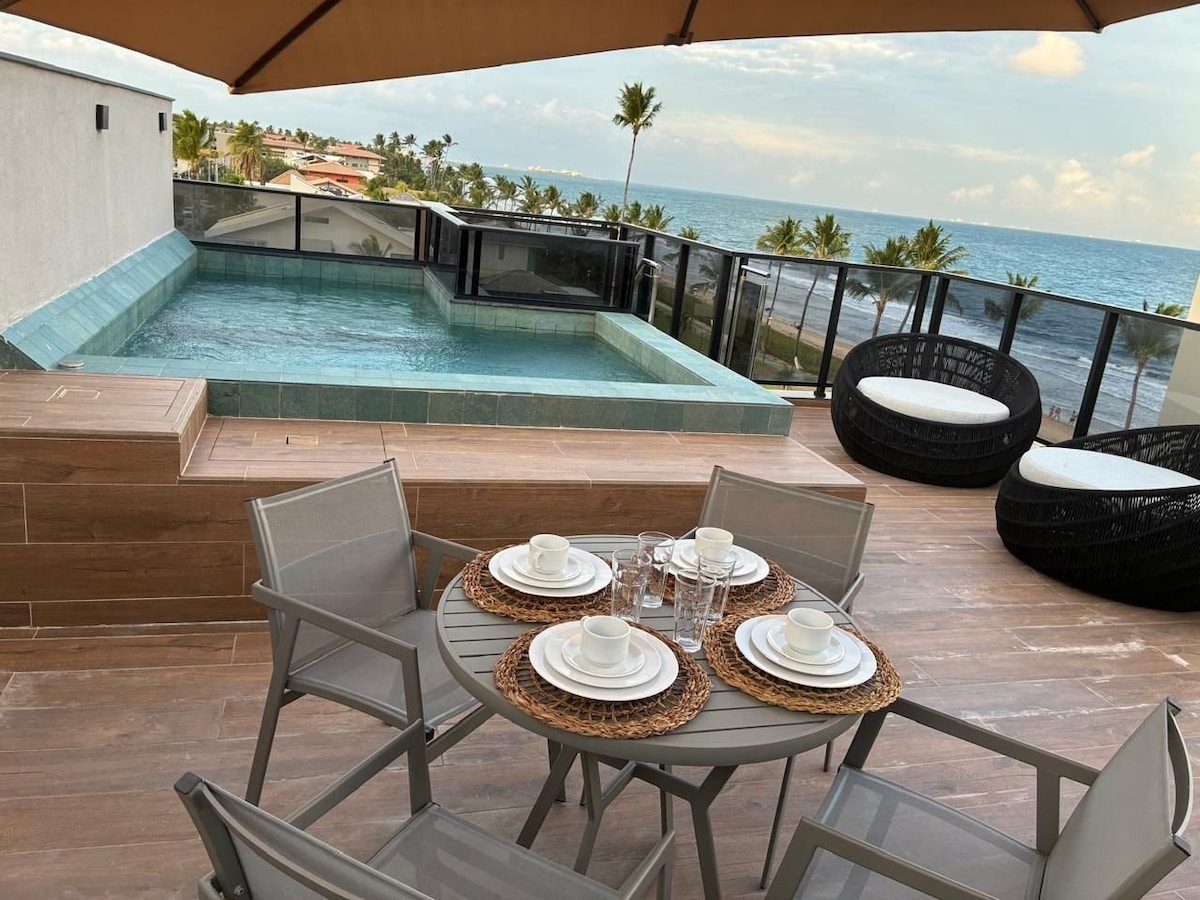 Melhor localização a beira-mar de Muro Alto. Praia simplesmente perfeita para família. Lindo apartamento vista mar e piscina, 3 banheiros sendo 1 lavabo+ 2 suites (uma com cama casal e outra com cama Queen reversível para duas camas solteirão) totalmente equipado, cozinha completíssima, smartTV, Wifi, varanda gourmet. Condomínio pé na areia super estruturado com serviço de praia, parquinho, campinho, mini mercado, academia e estacionamento