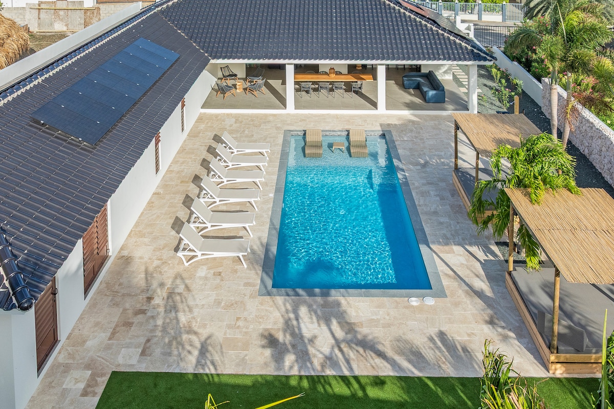 Op loopafstand (7 min) van de populaire Jan Thiel beaches met de restaurantjes, uitgaansgelegenheden, winkeltjes, casino en een supermarkt. De grote designvilla is in 2024 volledig gerenoveerd en ingericht als een pareltje. Extra grote slaapkamers waardoor eenieder zich ook makkelijk eens terug kan trekken. Grote smaakvol ingerichte buitenruimten met altijd wel een plek in of uit de zon. Last but not least een extra groot zwembad!