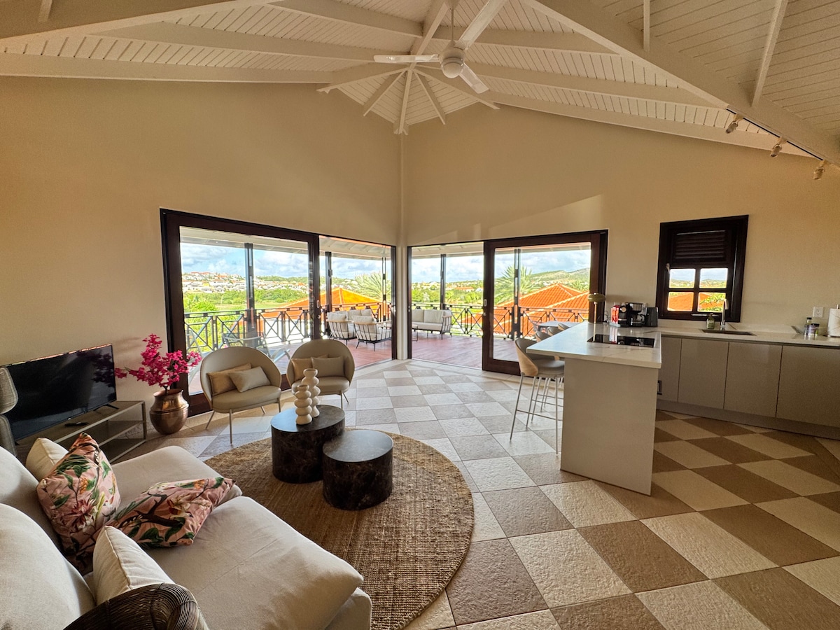 The villa is built on one of the nicest places on Coral Estate, with a spectacular 180 degree view on the Caribbean Sea. The villa designed around the centrally located kitchen with bar. Under the large palaparoof of the porch you sit in the shade and there is always a breeze blowing. From the spacious pool deck you step into the infinity pool. The villa is detached, has a spacious living room with a large kitchen with bar, 4 bedrooms, 3 bathrooms and a tropical garden.