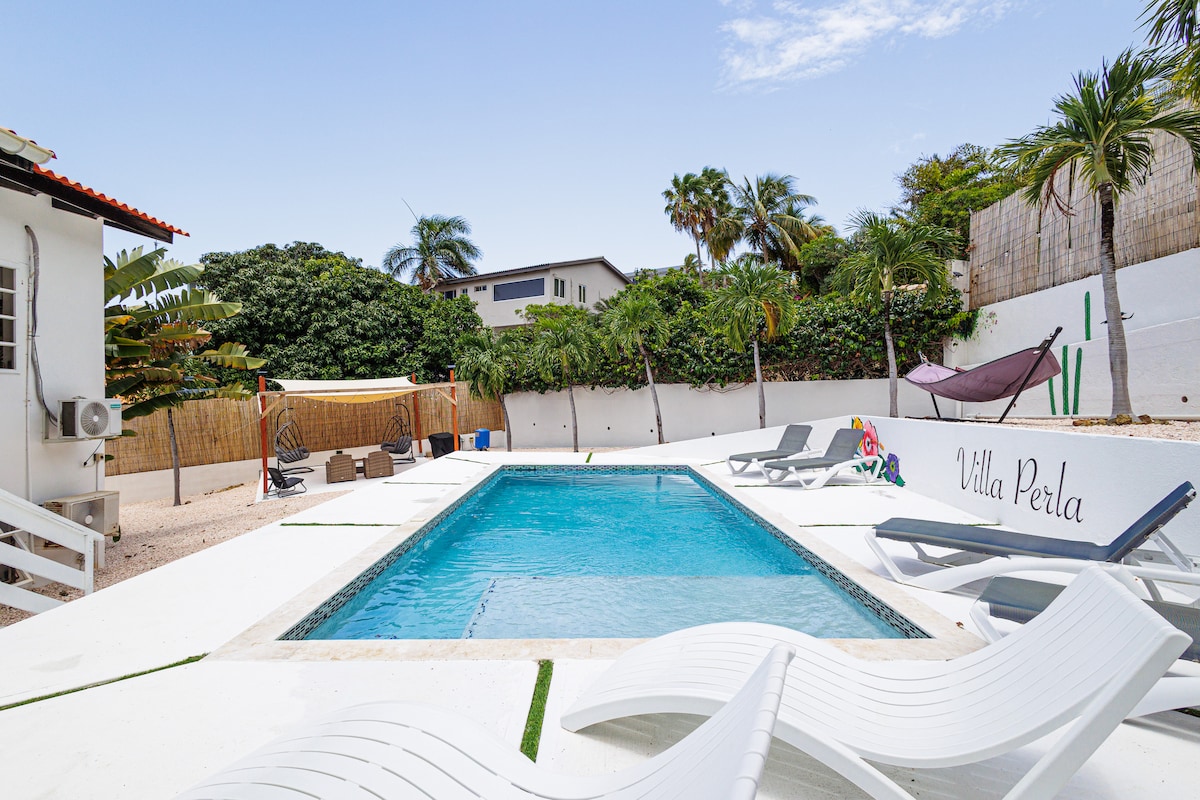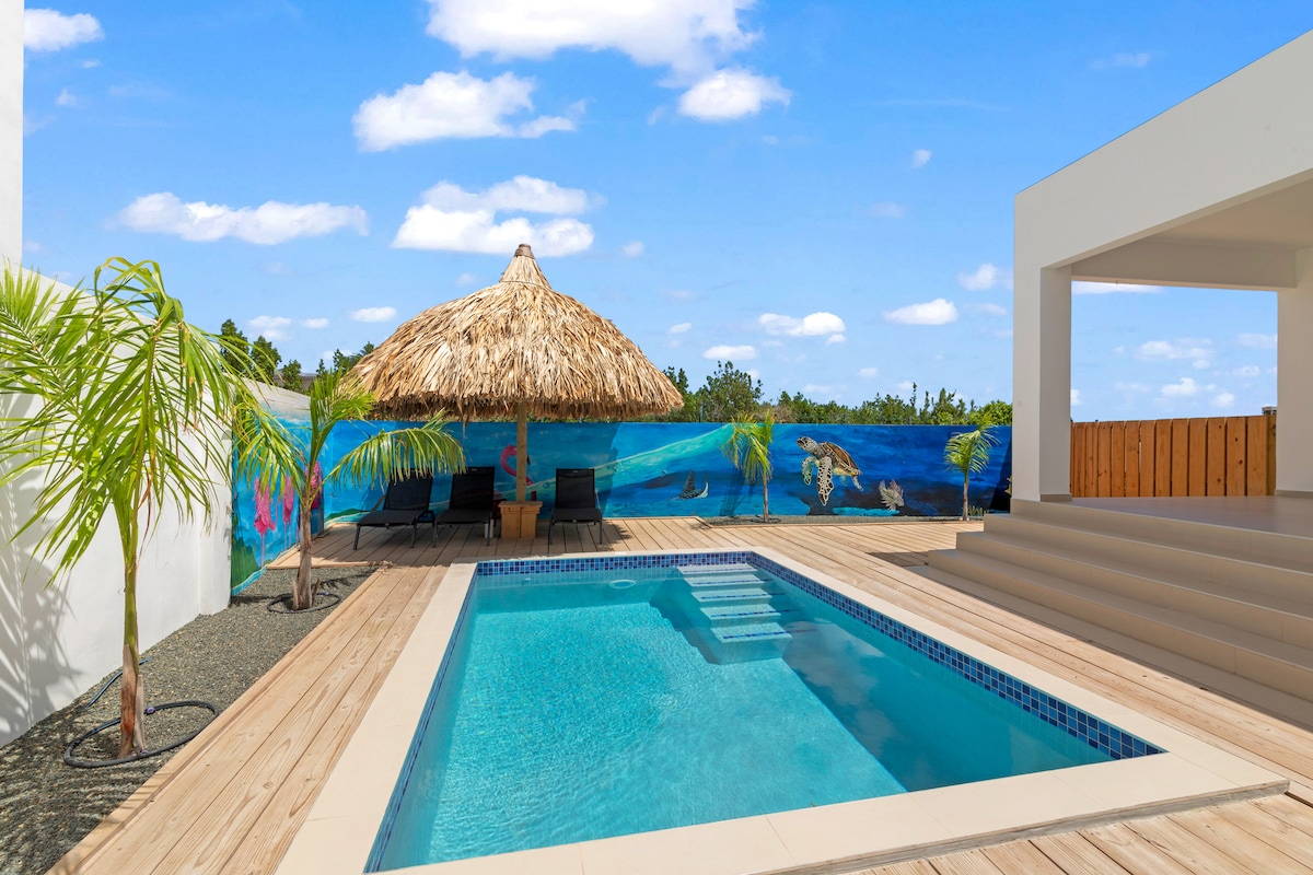 Located along the south coast of Curaçao in the iconic Penstraat lies Villa Petit Oasis, a beautifully renovated seaside house with a lush tropical pool, gazebo and BBQ. The authentic 50’s colorful floor tiles have been conserved, and both the living and dining area connect to the outside deck and swimming pool through harmonica doors that can be fully opened, providing for a cozy indoor-outdoor experience with complete privacy.