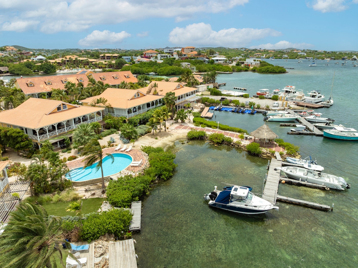 Relax in the pool or in the sea in front of this uniquely located Studio on the Spanish water. The studio has a spacious bathroom, a kitchenette and a lovely terrace with a view over the Spanish water. Take the Kayak to explore the Spanish Water with its mangrove forests and beaches. A 3-minute drive away, nearby you will find diving schools, windsurfing school, the beaches of Janthiel and Caracas Bay and in that district a number of restaurants, bars and supermarket.