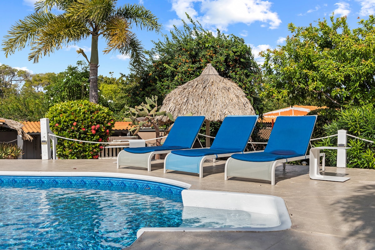 Kas Pelikan is a tropical holiday home in the quiet area of Julianadorp, Curaçao, with two modern 2-person apartments (#1 & #2) under one large palapa. Each apartment has air conditioning, a private kitchen, luxury beds, and comfortable seating indoors and outdoors. In the garden with soothing birdsong, guests enjoy a pool shared by both apartments. Privately located yet central, close to beaches, nature, supermarkets, and the airport. Free parking on secured premises. ⭐ Average 5-star rating