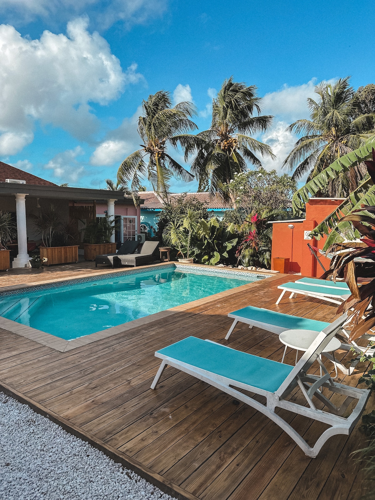 In this exotic mini-paradise with 3 unique apartments it’s all about you! Just 8 minutes from Mambo Beach and 10 from Jan Thiel, this gem awaits. My tropical (edible) garden with palm trees, colorful flowers, parrots, hummingbirds and iguanas is a true eye-catcher. The BBQ, outdoor kitchen, bar, washing machine and dishwasher are all yours to use. Take a refreshing dip in the pool or relax on a sunbed or in a hammock under a banana tree. Bon Bini to dushi Happy Curoase!