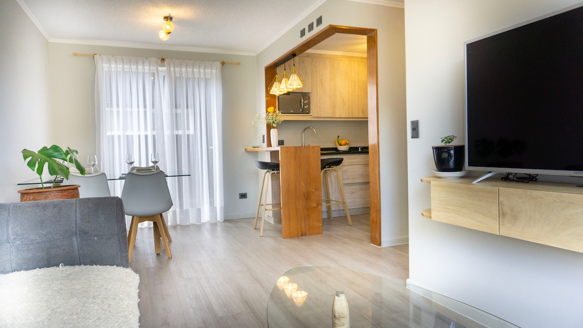Acogedor departamento en Jardin Urbano Acceso por cerradura con contraseña Capacidad para 5 personas Condominio cerrado, seguridad 24/7 3 habitaciones, 3 camas 2 baños, escritorio, cocina completa WiFi fibra optica Aire acondicionado Calefactores en cada habitación Terraza con vistas al jardín Mascotas bienvenidas Incluye toallas y sábanas limpias Televisión 4K Huéspedes sin reseñas deben enviar foto de su documento de identidad. Estacionamiento para 1 vehículo NO tenemos estacionamiento extra