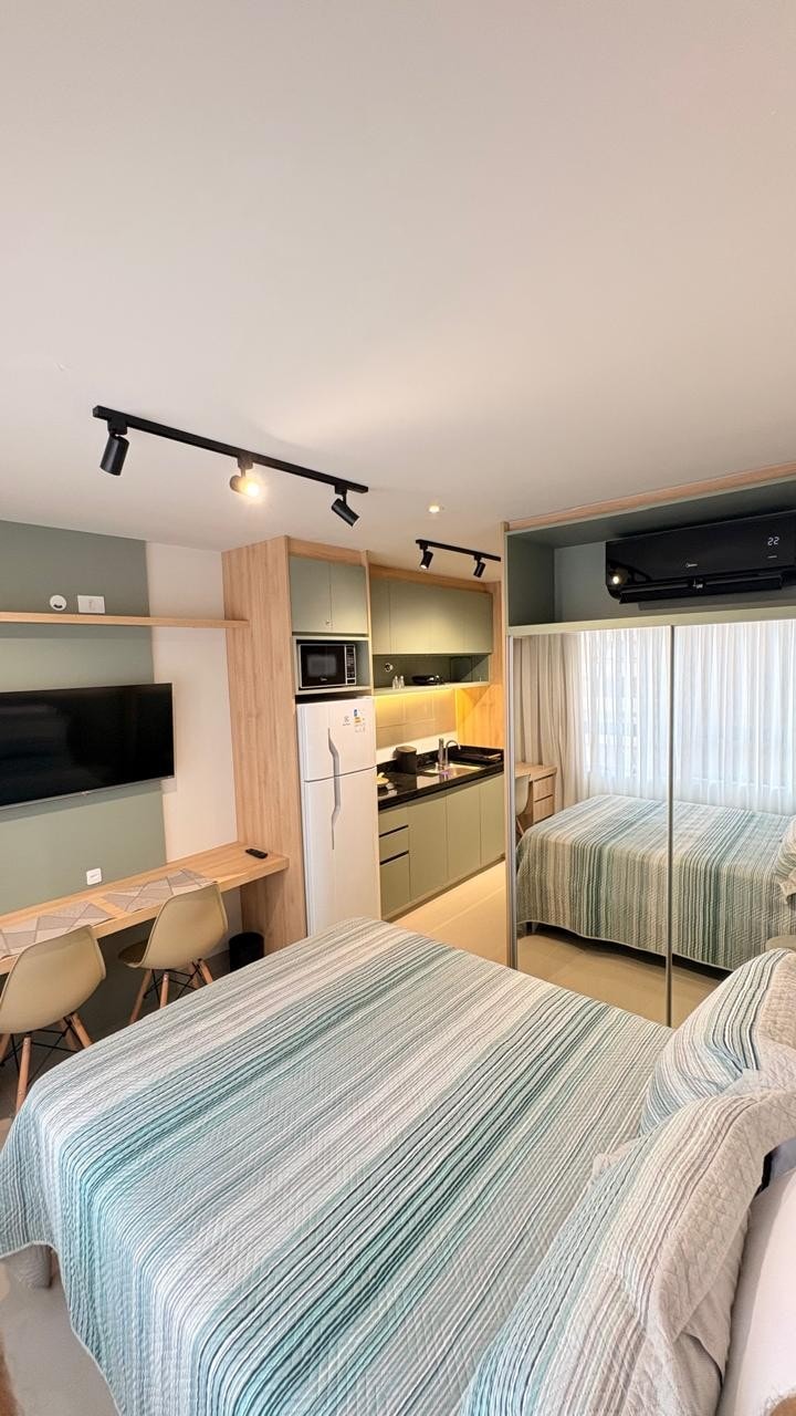 Studio de design assinado por arquitetos no coração de Curitiba. Totalmente mobiliado com decoração moderna e contemporânea, eletrodomésticos de primeira linha e acabamentos impecáveis. Acomoda até 3 pessoas com cama de casal e cama de solteiro. Cozinha completa, Wi-Fi de alta velocidade, Smart TV e ar-condicionado. Perfeito para trabalho ou lazer. Localização privilegiada no centro, próximo a tudo. Viva uma experiência de hospedagem superior em um espaço único e sofisticado! O chuveiro é pfto😍