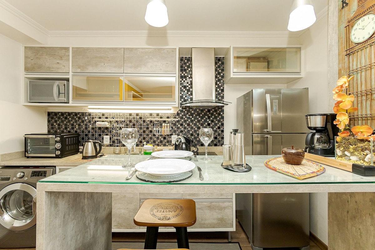 Relaxe neste espaço calmo e cheio de estilo. VAGA DE GARAGEM EXCLUSIVA NA UNIDADE. Espaço pensado em seu bem estar , tudo que você precisa, mais de 60 itens, bairro nobre , perto do Shopping Barigui, Mercadoteca com vários restaurantes, próximo ao Parque Barigui ,Hiper mercado Carrefour . A 5 minutos da UNIVERSIDADE POSITIVO e EXPOUNIMED . Mini mercado no térreo . A certeza de uma estadia perfeita.