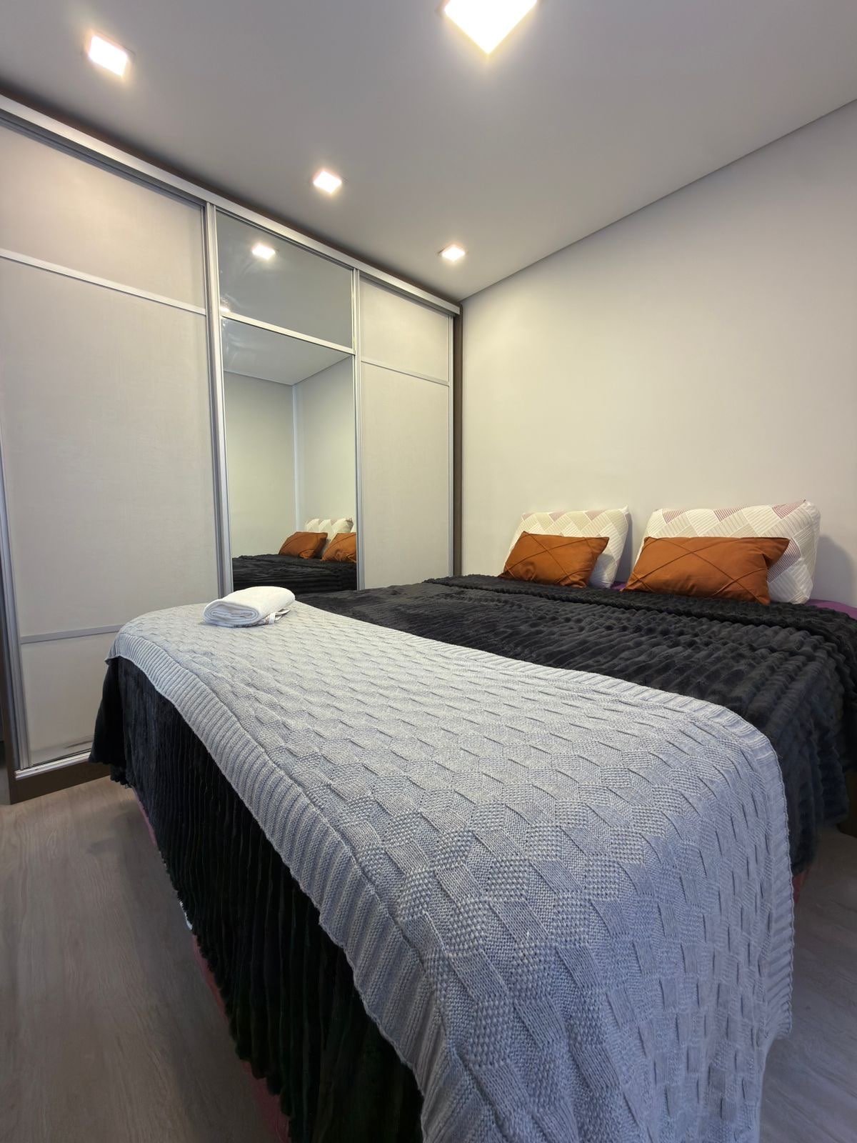 Two-bedroom apartment in a prime location in Pinheirinho. It offers a spacious private parking space that accommodates a pickup truck. Amenities include fast Wi-Fi, gas shower, washer-dryer, 127V and 220V outlets, bed linen, towels, and there will always be coffee. The condominium features a wooded area with a lake and animals, swimming pool, barbecue areas, a self-service mini market, 24-hour concierge, and facial recognition access.