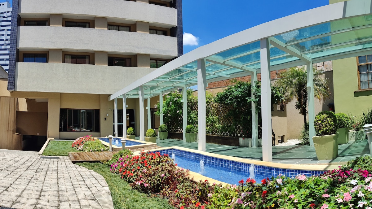 Studio moderno, novíssimo, aconchegante, perfeita localização, com uma linda vista da sacada, principalmente a noite . Wi-Fi rápido, mesa de trabalho, TV smart 55” , cama Queen. Ar condicionado (quente/frio). Máquina de lavar e secar roupa e uma linda ilha na cozinha. 50m2 de muito estilo-27ºandar, Silencioso. No Centro/Batel, próximo à comércios, bancos, shoppings, polo gastronômico e Hospital . No prédio :Piscina, academia, sala de jogos, sauna, jacuzzi, portaria 24 horas.