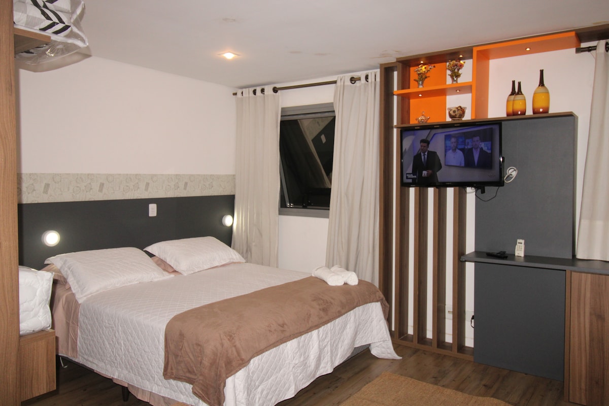 Roupa de cama e banho padrão hotelaria. Colchão novo e padrão hotel . Chuveiro com central a gás. Limpeza padrão hotelaria. Capacidade até 02 adultos. É imprescindível o envio do nome completo e cpf. Não temos vaga incluso na diária. Estacionamento terceirizado no subsolo. Não permitimos visitantes, apenas hóspedes previamente cadastrados. Não aceitamos reservas para terceiros, um dos hóspedes obrigatoriamente deverá ser o solicitante da reserva.