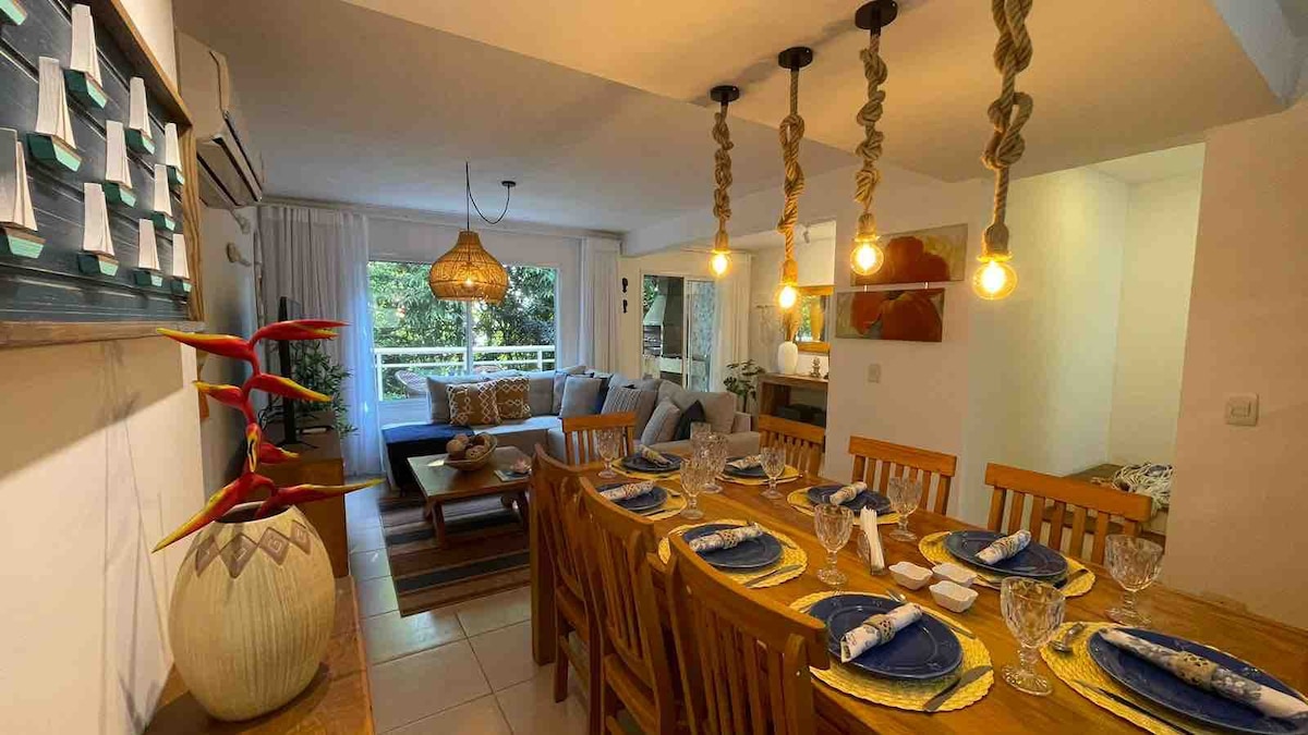 Localizada na Praia do Curral, com a melhor infraestrutura da Ilha, a 150 metros do mar, apartamentos completos, com 1 dormitório com cama Queen e ar condicionado split, sala com bicama sendo 2 camas de solteiro e TV 42 polegadas, cozinha completa, banheiro e lavabo . 1 vaga de garagem. Ducha direto da Cachoeira, lugar tranquilo e sem barulho, venha desfrutar de um lugar paradisíaco. Alugo mensal também. O andar superior da casa não faz parte da locação, a Apartamento fica no térreo