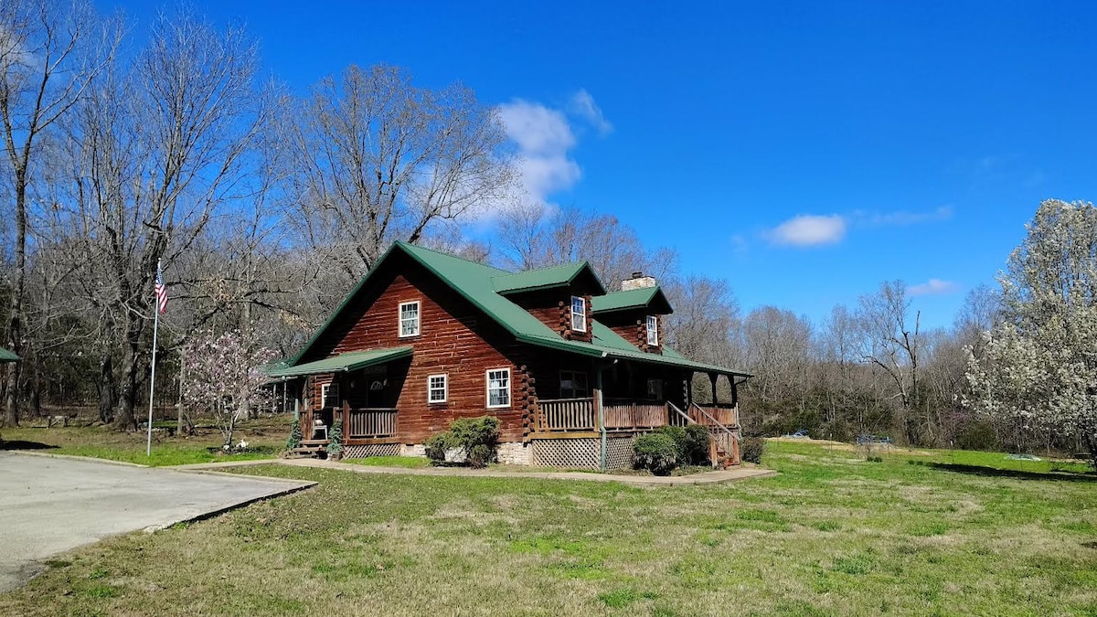 Gorgeous Riverfront Cabin located just minutes from town. Private boat ramp, fire pit, bbq grill, lounge chairs, washer and dryer, daybed swing under porch in the shade next to river, custom kitchen with 48 inch stainless range, propane burners and duel electric ovens for the chef, wrap around deck, patio couches, chairs, and table, rope lights on a timer going around porch and into trees in the yard, large back yard with shade trees, almost 300ft of river frontage, two big screen tvs.