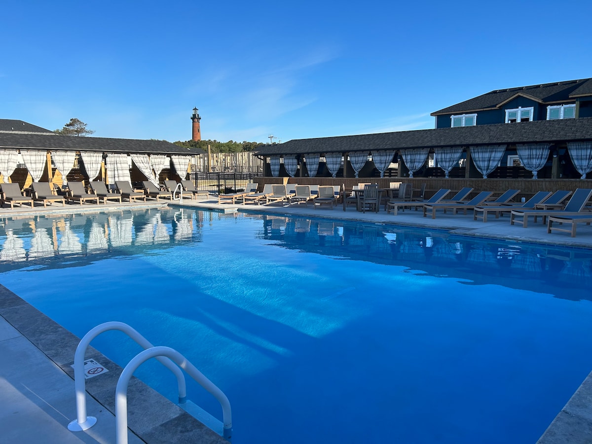 Your family will be close to everything when you stay at this centrally located brand new luxury condo, Seaduced! Steps to the beautiful wide beach, the large pool, and the Currituck lighthouse. We have provided everything you need to come relax at the beach in a clean, stylish, modern place. Comfortable beds and furniture await you, fully equipped large kitchen with lighthouse view while you enjoy breakfast at the extra long kitchen island. This will feel like your home away from home!
