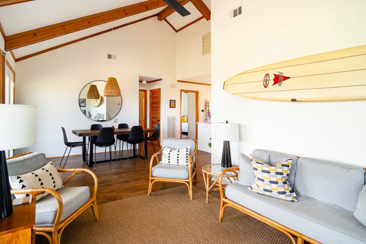Original 1954 Southern Shores flat top which has been completely renovated. You will have the entire first floor. Owners added a second story and reside upstairs. Very private with a separate entry. Just a short walk of 1/4 mile to the beach. House includes 2 bedrooms, 1 bathroom, living room, full kitchen and covered front porch. 50 inch tv with roku, WiFi. There is a private back yard and an outside shower. 2 parking spaces for guests.