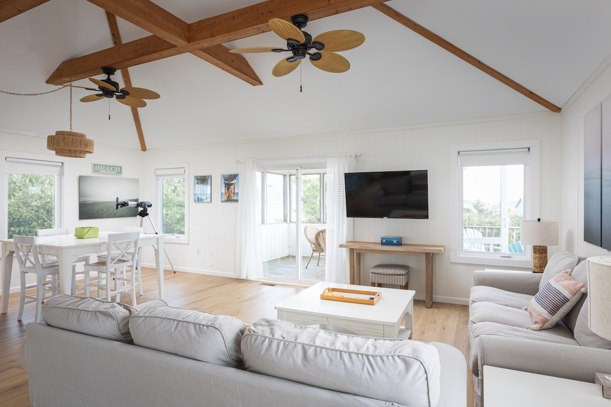 Updated Beach Cottage, short 5 min walk past 7 homes to the beautiful uncrowded beach. See reviews! Soundfront community pool 5/19-10/13 & tennis! Modern kitchen, baths, flooring, furnishings, appliances, decor. Comfortably sized bedrooms, open great room & dining. (1 K, 1 Q, 2 Twins). 2 TV's. Open decks, large screen porch, laundry, grill. Linens provided. Very quiet low density family neighborhood. Walk/bike to beach, Town of Duck for shopping, dining, soundfront boardwalk, & watersport fun.