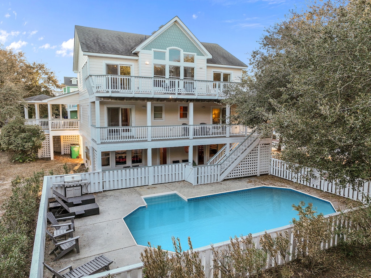 Welcome to The Real Escape - our vacation heaven! We love and take care of our home - and hope you will too! ~ Private Pool & Hot tub, 2 minute walk to large community pool ~ 4 bedroom & 4 bathrooms, Sleeps 9 ~ Open concept with huge entertaining area ~ Multiple decks w/endless views ~ Golf carts welcome! ~ Level 2 EV Outlet & free charging! ~ Currituck Club has a trolley service for you & your family to/from the beach (in season) ~ Must be 25+ to rent