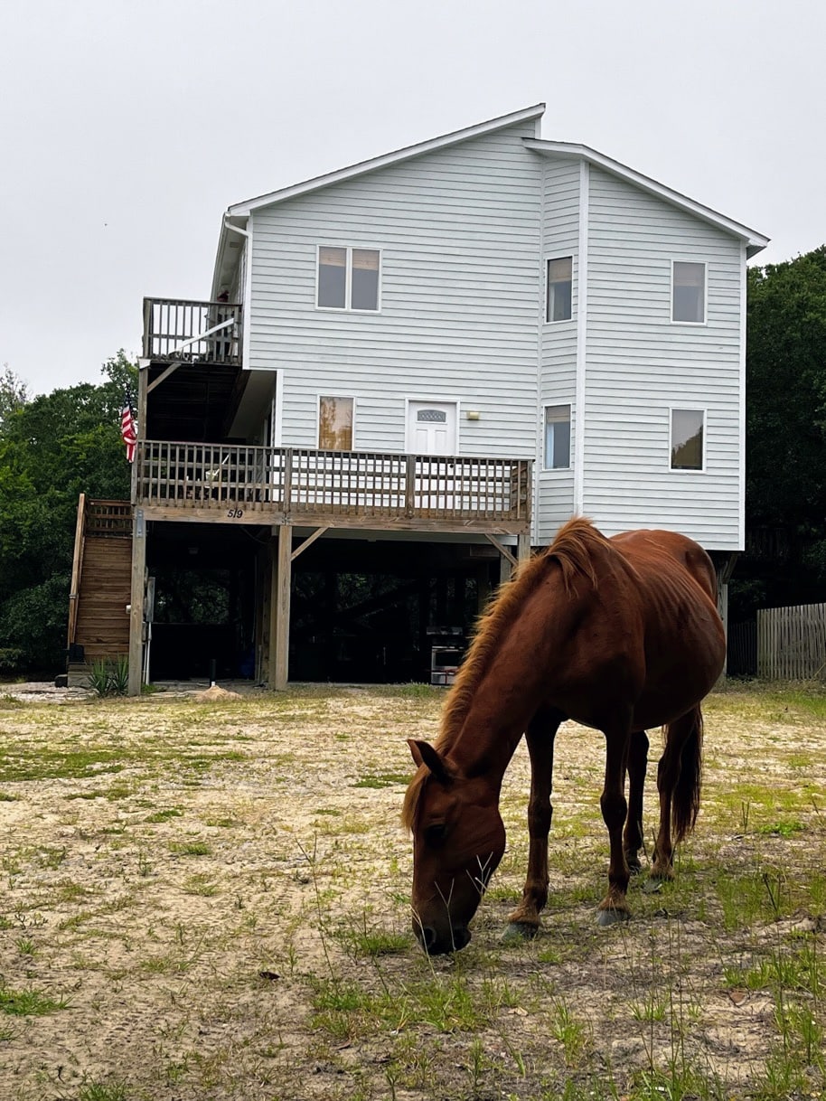 Awesome off road getaway! You will need 4 Wheel Drive (not awd) vehicle to access the property as there are no roads. Newer construction on the beach in Carova right next to the wild horse preserve. You will likely see horses on a daily basis! Home has 3 bedrooms and 3 baths with 3 deck areas to enjoy the ocean views, sunsets and breezes! Easy walk to the beach, parking passes included. New party deck with hot tub, grill, table, seating and string lights.