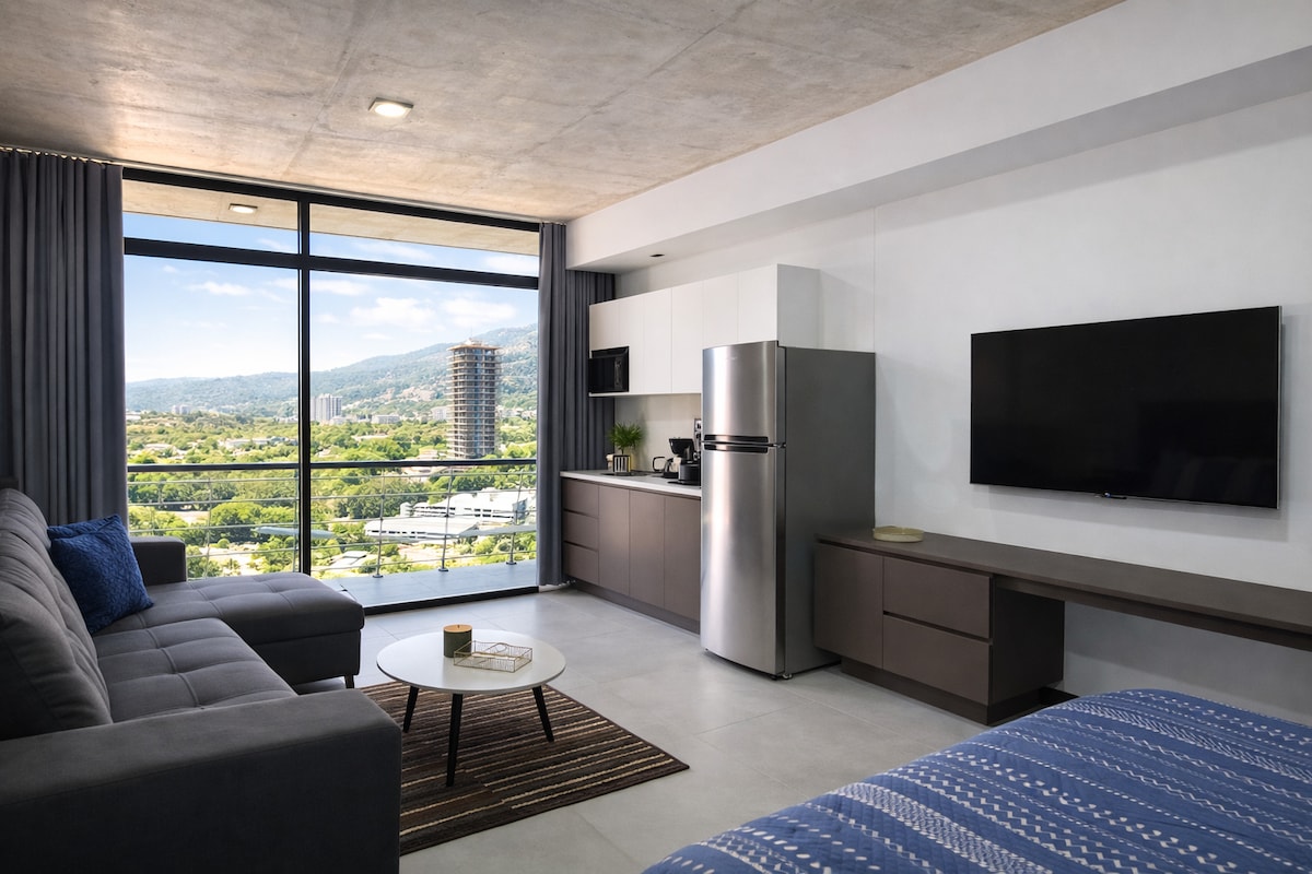 Experience San Salvador from a modern retreat in the exclusive Avitat Joy tower. This stylish 2-bedroom apartment offers breathtaking panoramic city views from a private balcony. Perfect for 2-4 guests, it includes access to a pool, gym, rooftop terrace, and coworking space. Located in the prestigious Lomas de San Francisco, you're minutes from top dining and shopping. Includes two free parking spaces.