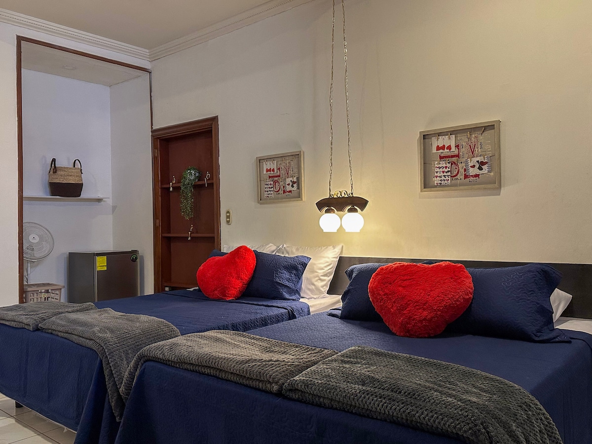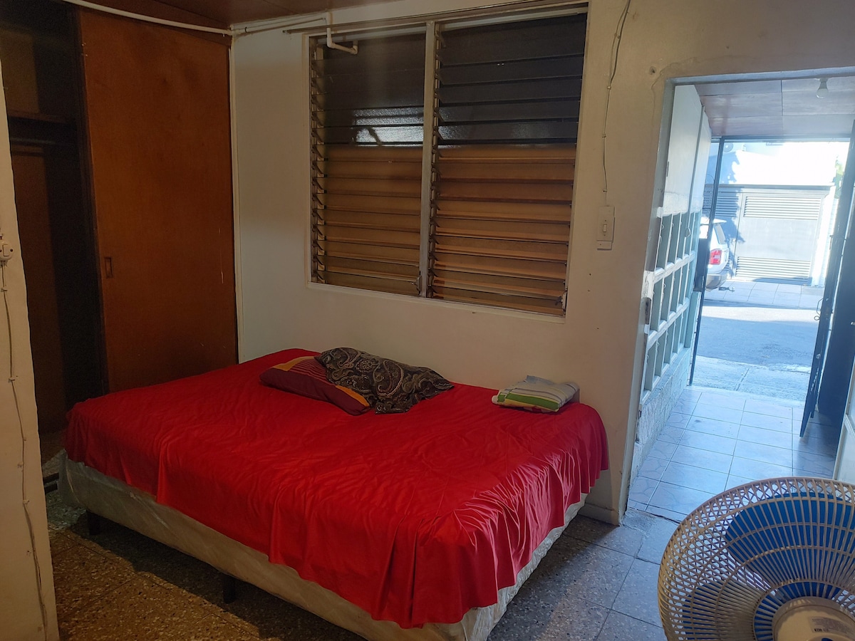 Disfruta de la sencillez de este alojamiento tranquilo y céntrico. La habitación cuenta con una cama matrimonial Smart TV con Netflix y hbo Max, baño propio, aire acondicionado,internet, incluye ropa de cama papel toallas.refrigeradora en área compartida. Disponible lavadora y secadora por un costo adicional ($5) La ubicación es accesible a centros comerciales, restaurantes, farmacias, supermercados, bancos, Atm, y muchos lugares más.