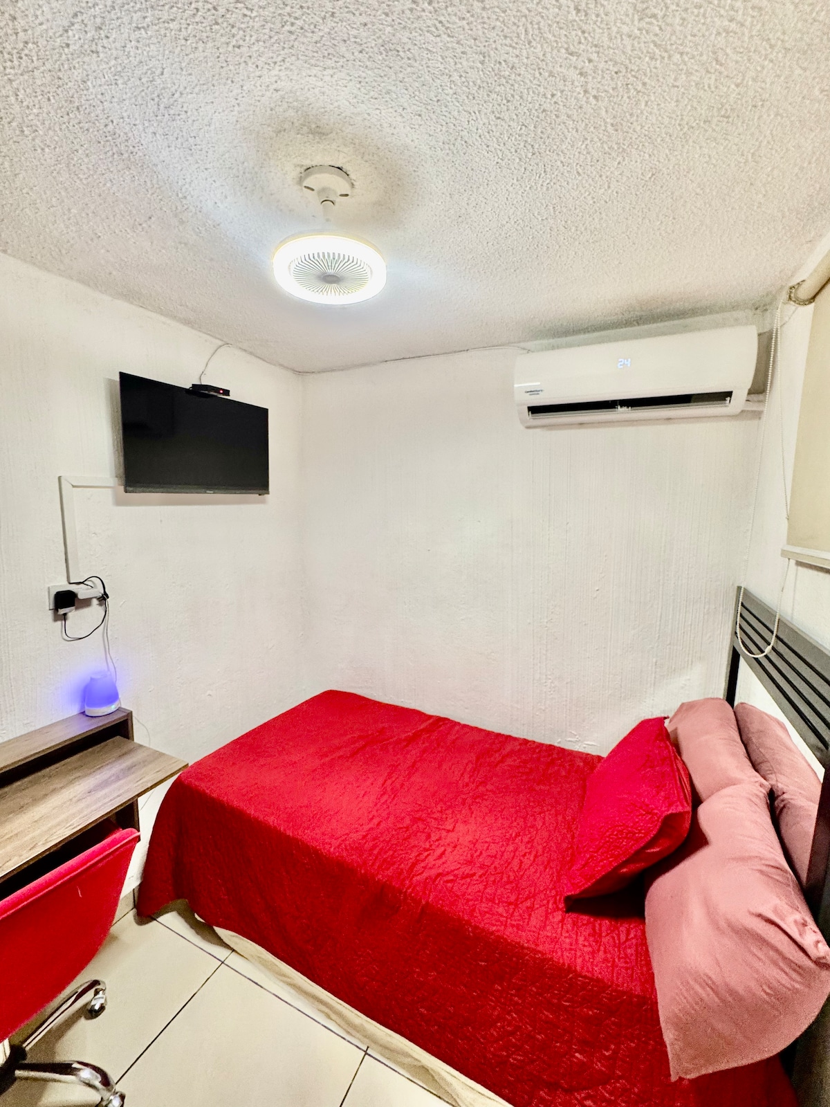 Si buscas una habitación cómoda, esta es tu opción! Una cama king comfort deliciosa, tipo hotel… aire acondicionado, televisor en un espacio amplio en el que puedes iniciar tu día con un cafecito recién hecho… cuenta con un baño privado muy cómodo. Tenemos un área compartida con una cocina equipada, comedor, muy seguro y agradable. Cerca de plaza Millenium, Galerías, metro centro… el Estadio Magico González. Puedes pedir comida de la casa por si no quieres cocinar! Se la pides a Carlos anticipad