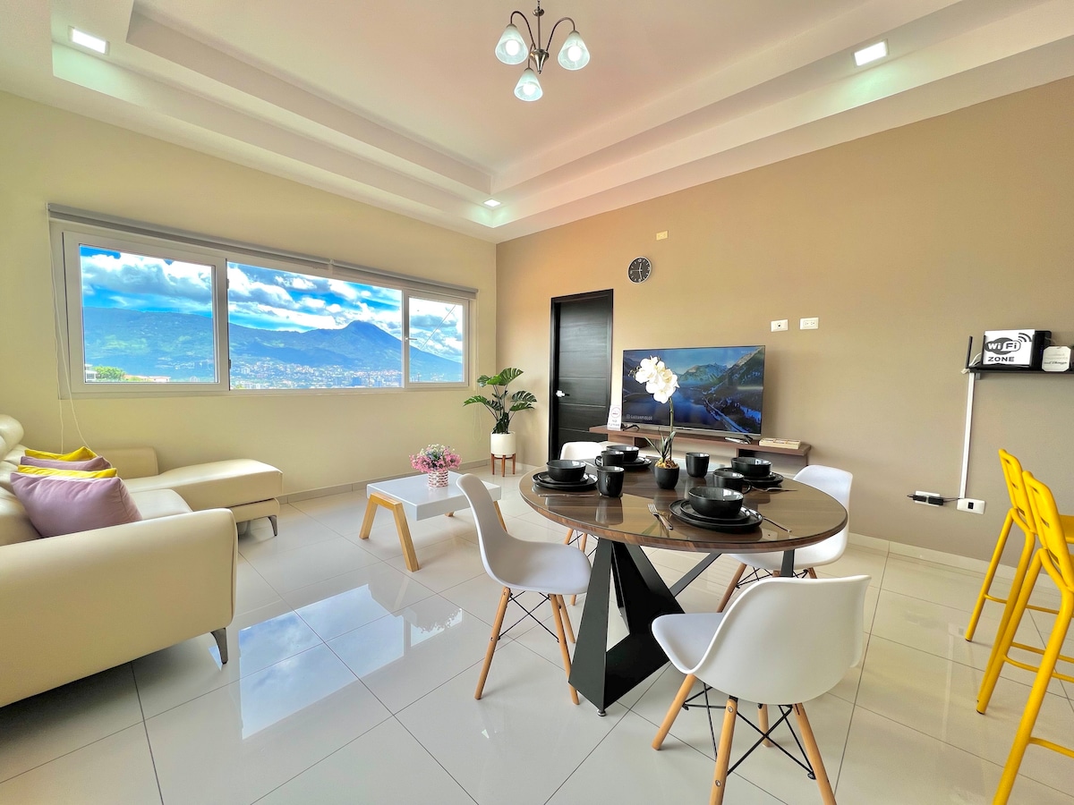 ✨ AIR CONDITIONING IN LIVING ROOM ✨ Enjoy a comfortable stay in a new and private tower with all the modern amenities. This spacious and bright apartment feels just like home. From the balcony, take in a stunning view of San Salvador city and the volcano, especially at sunset. Located in an exclusive and safe area, it features a modern lighting system designed for your comfort and relaxation.