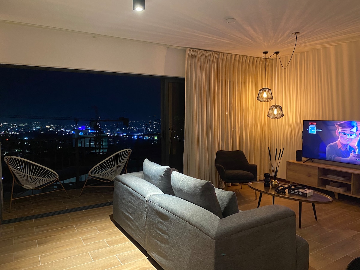 ✨ AIR CONDITIONING IN LIVING ROOM ✨ Enjoy a comfortable stay in a new and private tower with all the modern amenities. This spacious and bright apartment feels just like home. From the balcony, take in a stunning view of San Salvador city and the volcano, especially at sunset. Located in an exclusive and safe area, it features a modern lighting system designed for your comfort and relaxation.