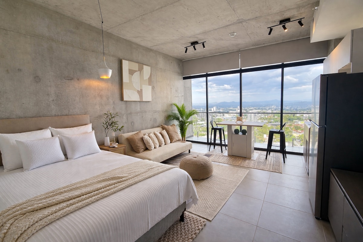 Your Modern Home in Antiguo Cuscatlán ✨ Stay in a stylish 1-bedroom apartment on the 11th floor, offering breathtaking views of San Salvador. Perfect for business trips, long-term stays, or a secure and comfortable base while exploring the city. Includes: ✔️ King-size memory foam bed, blackout curtains, desk & chair for remote work. ✔️ Modern living room with 65" Smart TV, Alexa, and sofa bed (1.70m). ✔️ Fully equipped kitchen ✔️ Private balcony with panoramic views ✔️ Parking & high-speed WiFi