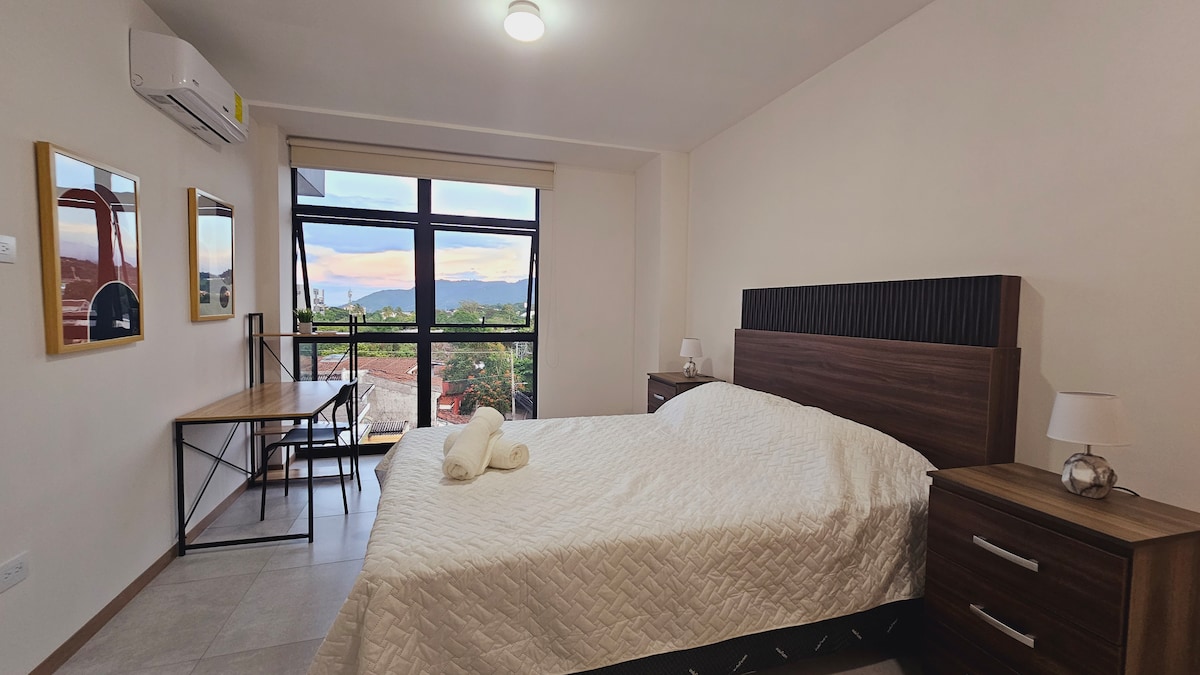 Apartamento nuevo, totalmente equipado y amueblado con una sola cama matrimonial, con decoración moderna pensado en garantizarte una cómoda y agradable estadía. Ideal para relajarte, disfruta de tu café por la mañana en la terraza con una gran vista a la ciudad o disfruta una copa de vino en la noche con la excelente vista a San Salvador. En una zona céntrica, estratégica y segura, cerca de supermercados, centros comerciales. A solo 40 minutos del Aeropuerto,