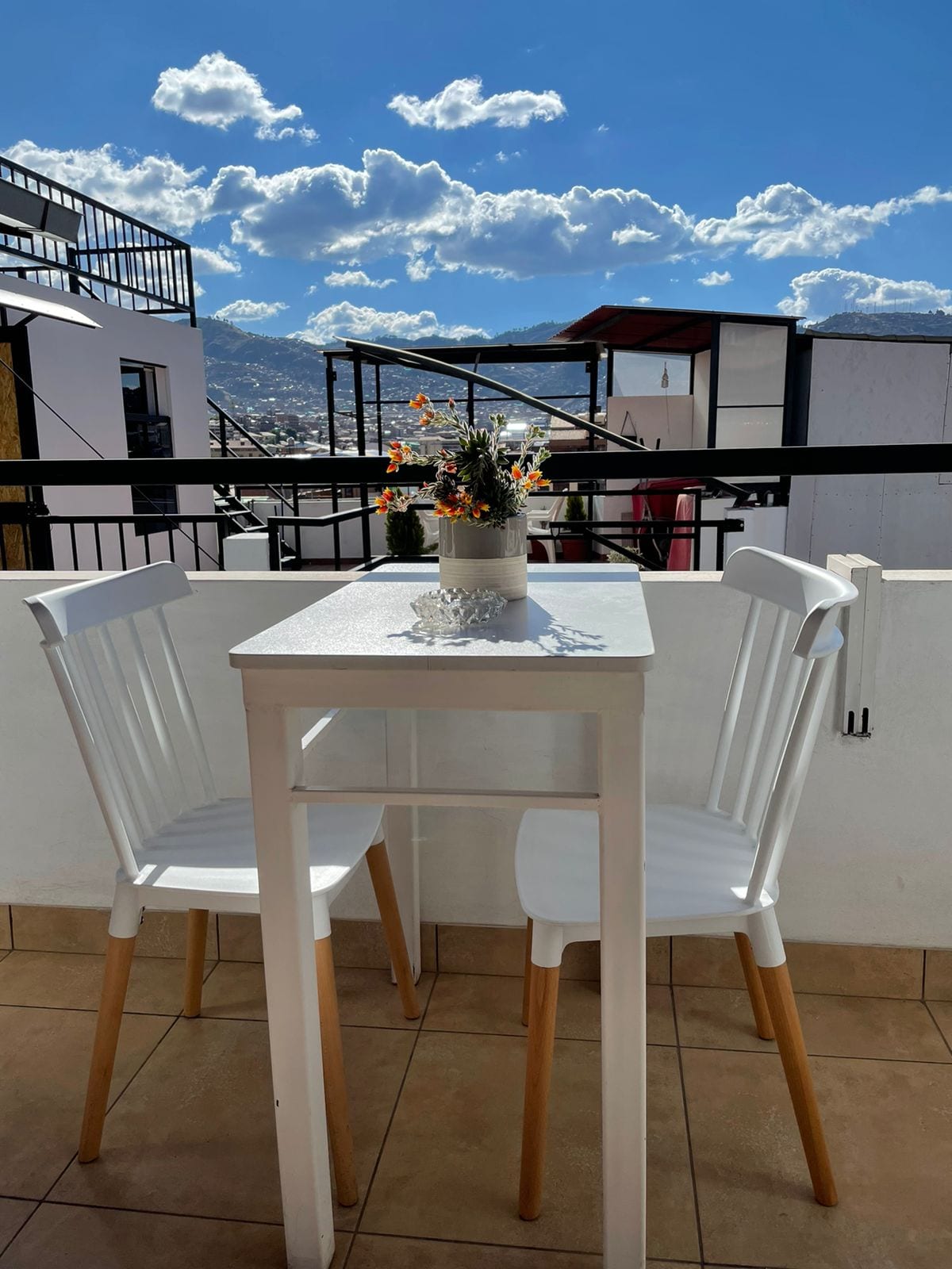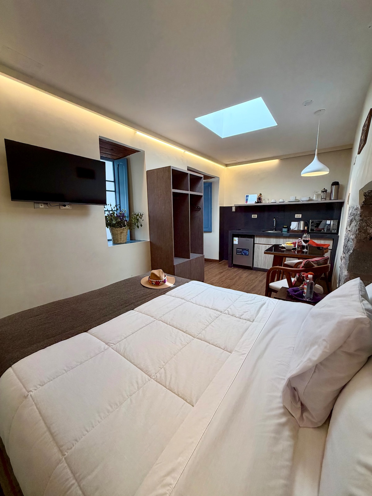 Moderno y confortable studio ubicado en una zona céntrica de Cusco, donde podrás encontrar muy cerca supermercados, restaurantes, farmacias, entidades bancarias y financieras, casas de cambio, clínicas de salud y otros, decoración moderna sencilla, funcional, acogedor y bien iluminado. Sala con Wifi, Netflix, Cable mágico, sofá confortables, kitchenette totalmente equipado, ducha con abundante agua caliente las 24 horas, terraza con sombrilla y vista panorámica de la ciudad.