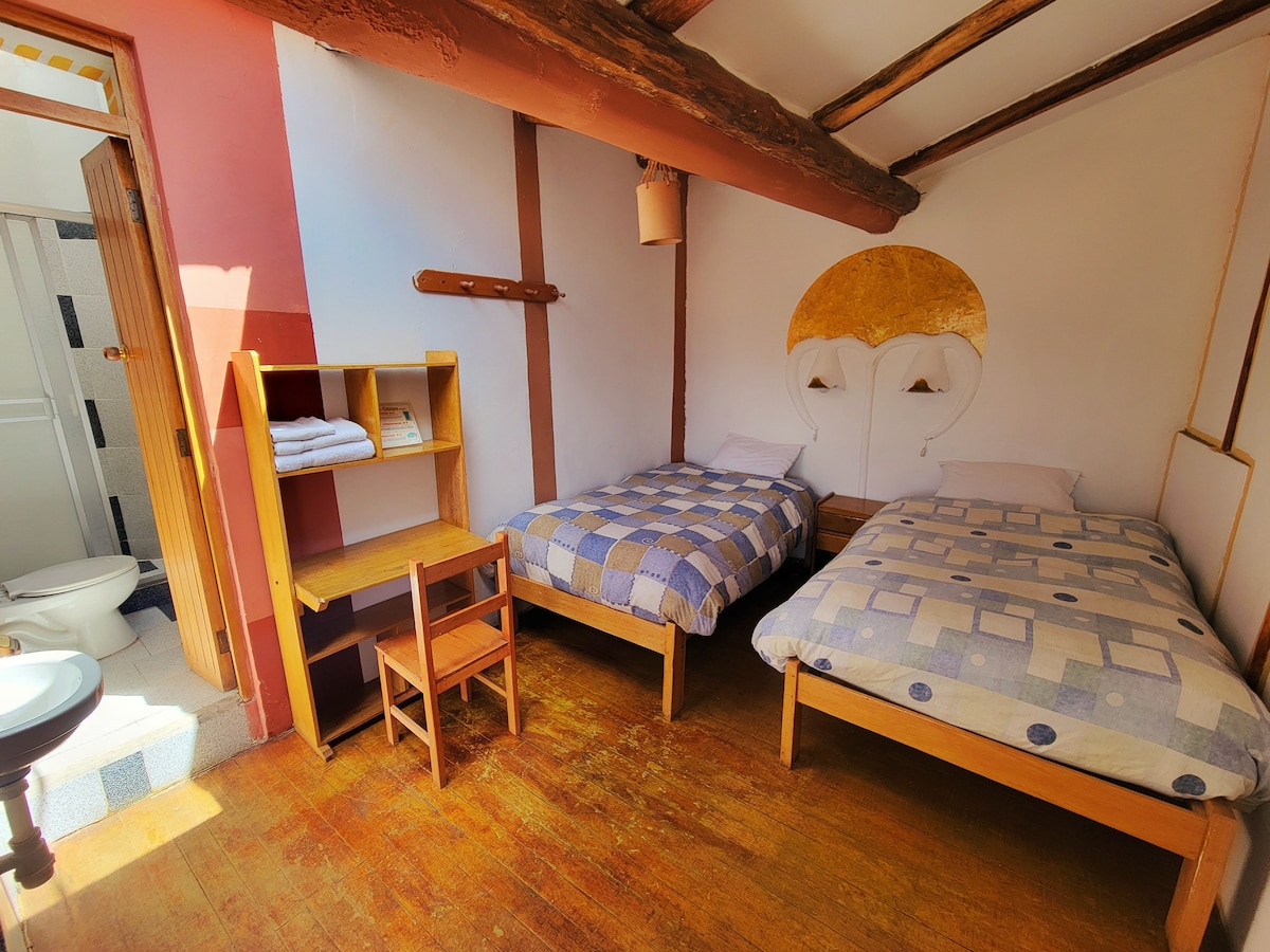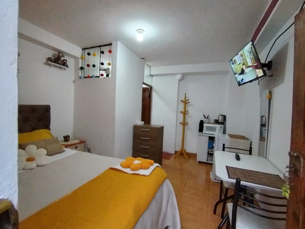 Small and lovely rooom with a small living room space and a private bathroom in a peruvian house from colony tymes! Oh a sorry note! I am trying to change the adress registered on my add, the house is at Alabado one block away from Cuesta San Blas! Por la antiguedad de la zona y la presión de agua en el barrio el agua caiente se ve afectada de 11 am a 4 pm y de 7 pm a 3 am. Proveemos una alternativa de ducha privada en el primer piso en esos momentos.