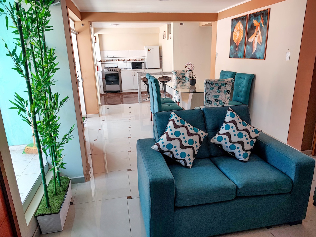 Nuestro departamento tiene una perfecta ubicación al estar en una zona tranquila y segura, cerca de los mejores comercios y lugares de esparcimiento, a 7 minutos del centro histórico. Este acogedor y amplio departamento está totalmente amoblado y equipado para alojar a 6 personas en una zona con seguridad garantizada. Contamos con 3 habitaciones y 2 baños completos, así como agua caliente las 24 horas del día.