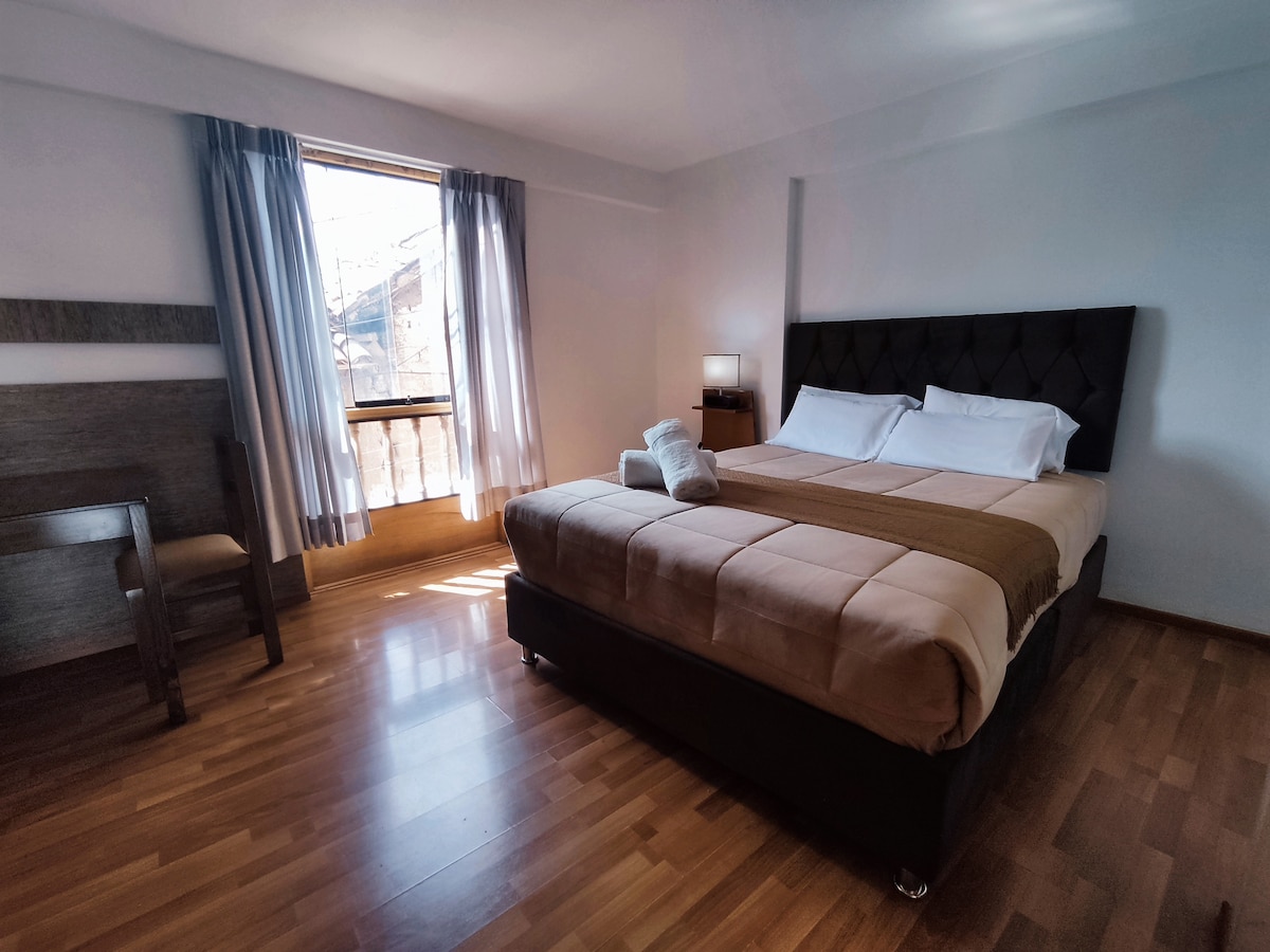 Esta habitación tiene un balcón que ilumina todo el espacio y le da ese encanto clásico de casona antigua. La ubicación es excelente: estás literalmente a pocos pasos de la Plaza de Armas, rodeado de restaurantes, cafeterías y puntos turísticos. Al ser una zona céntrica, puede haber algo de ruido de autos o personas, típico de una zona tan céntrica. Es un espacio ideal para viajeros que buscan buena ubicación, comodidad y una experiencia auténtica en el centro histórico.