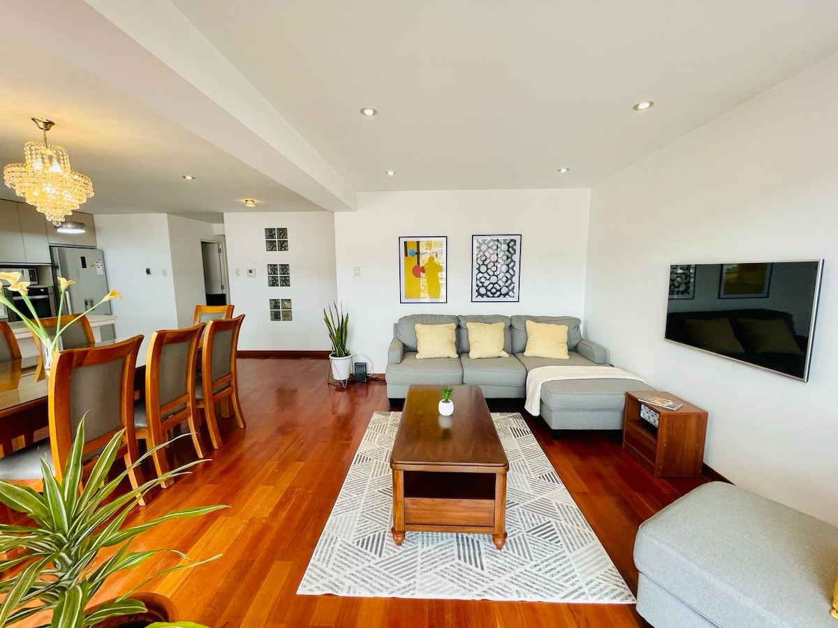 El apartamento se ubica en una zona céntrica de Cusco, donde podrás encontrar muy cerca supermercados, restaurantes, farmacias, entidades bancarias y financieras, casas de cambio, clínicas de salud y otros, decoración moderna sencilla, funcional, acogedor y bien iluminado. Sala con biblioteca, Wifi, Netflix, Cable mágico, sofás confortables, moderna cocina y comedor totalmente equipado, duchas con abundante agua caliente las 24 horas, terraza con sombrilla y vista panorámica de la ciudad.