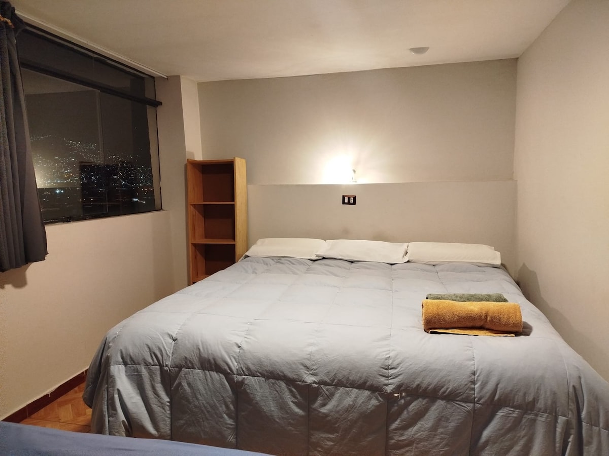 Departamento amplio con todos los servicios para una estadía cómoda y placentera Dos habitaciones: *HABITACION DOBLE KING: 1 CAMA KING SIZE TRES PLAZAS 1 CAMA MATRIMONIAL TV CABLE MUEBLES Y ROPERO WIFI * HABITACION DOBLE MATRIMONIAL: 2 CAMAS MATRIMONIALES TV CABLE SMART MUEBLES Y ROPERO WI FI * SALA AMPLIA * COCINA AMPLIA Y EQUIPADA * SERVICIO DE LAVANDERIA GRATIS INCLUIDO * 1 BAÑO AMPLIO AGUA CALIENTE 24 HORAS * GARAGE CONSULTAR DISPONIBILIDAD,SUJETO A HORARIO * 3 PISO SIN ASCENSOR