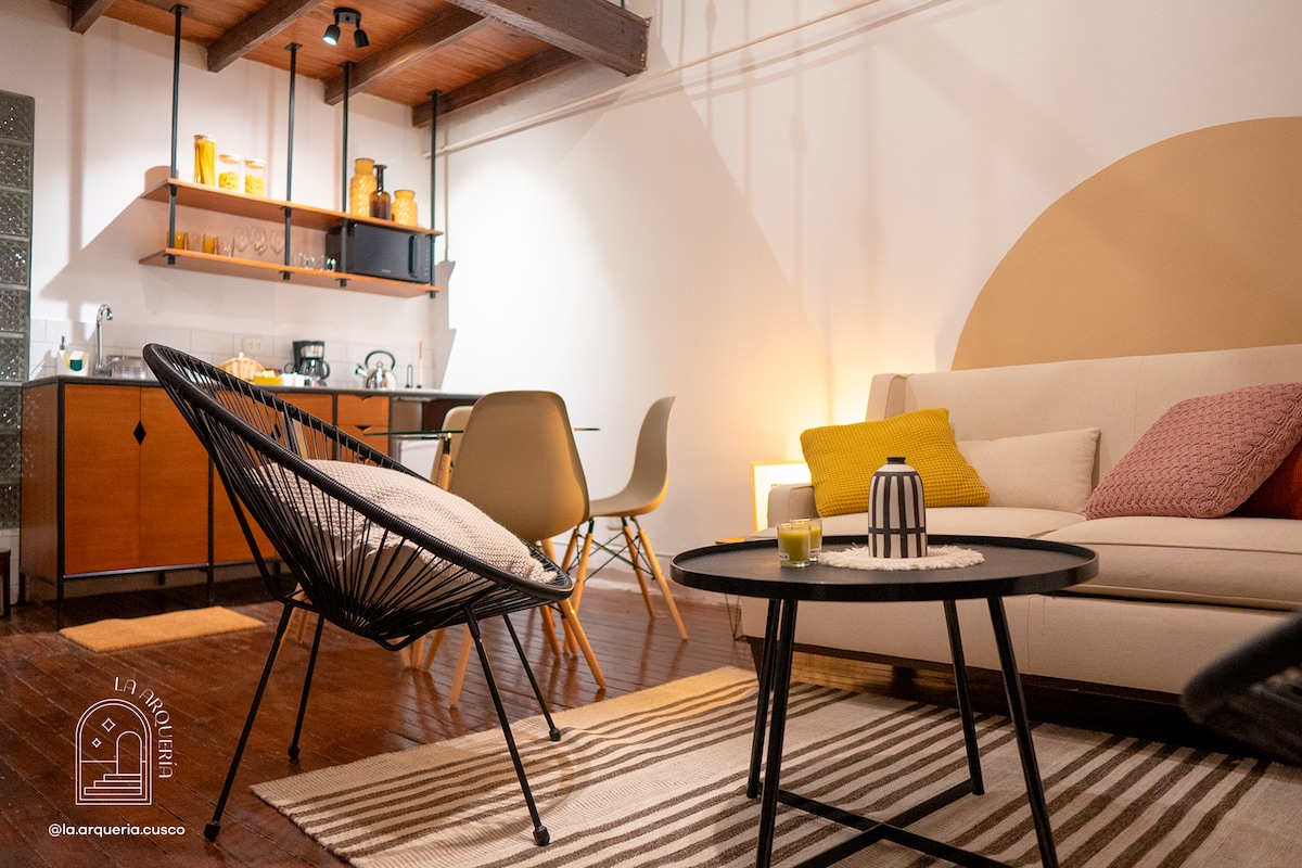 Bienvenidos a La Arquería Colonial Residence. Un espacio creado para que puedas disfrutar tus días en el Cusco y vivir la experiencia de estar en una casona colonial de los años 1600 a solo 3 cuadras de la Plaza de Armas y a media cuadra del museo Qorikancha. El loft cuenta con una cama queen, sala, escritorio para homeoffice, comedor, cocina completamente equipada, baño privado con tina, un altillo con una cama de dos plazas y terraza. Entrada independiente con salida a jardines de casona.