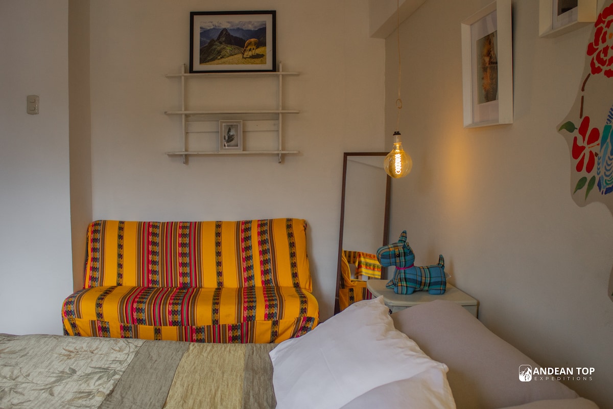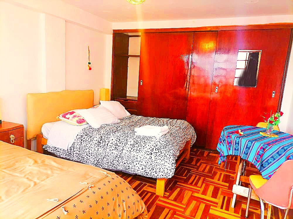 El depártamento se encuentra ubicado en el tercer piso y cuenta con sala, comedor, cocina , zona de entretenimiento y lavanderia y cuenta con 2 dormitorios, todo el departamento tiene luz natural a los dormitorios con ventanas amplias , el departamento es independiente y amoblado, el dia que arrivan a cusco les recojemos del aeropuerto o terminal terrestre para trasladarlos y darles las llaves . pueden hacer uso de la terraza que tiene una linda vista de la ciudad.