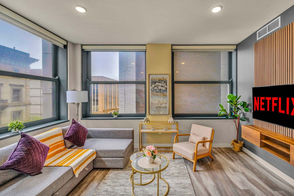 You will enjoy a stylish experience at this centrally-located suite. Free parking lot behind the building! Keyless entry. Luggage drop-off available (please request code). Lightning fast wifi. Free coffee & complimentary essentials in equipped kitchen Body Wash / Shampoo / Conditioner are complimentary! Paid laundry available in common area hallway. Laundry pods complimentary Queen bed sleeps 2. Pack'n Play or Roll Away Bed Available on request for fee.
