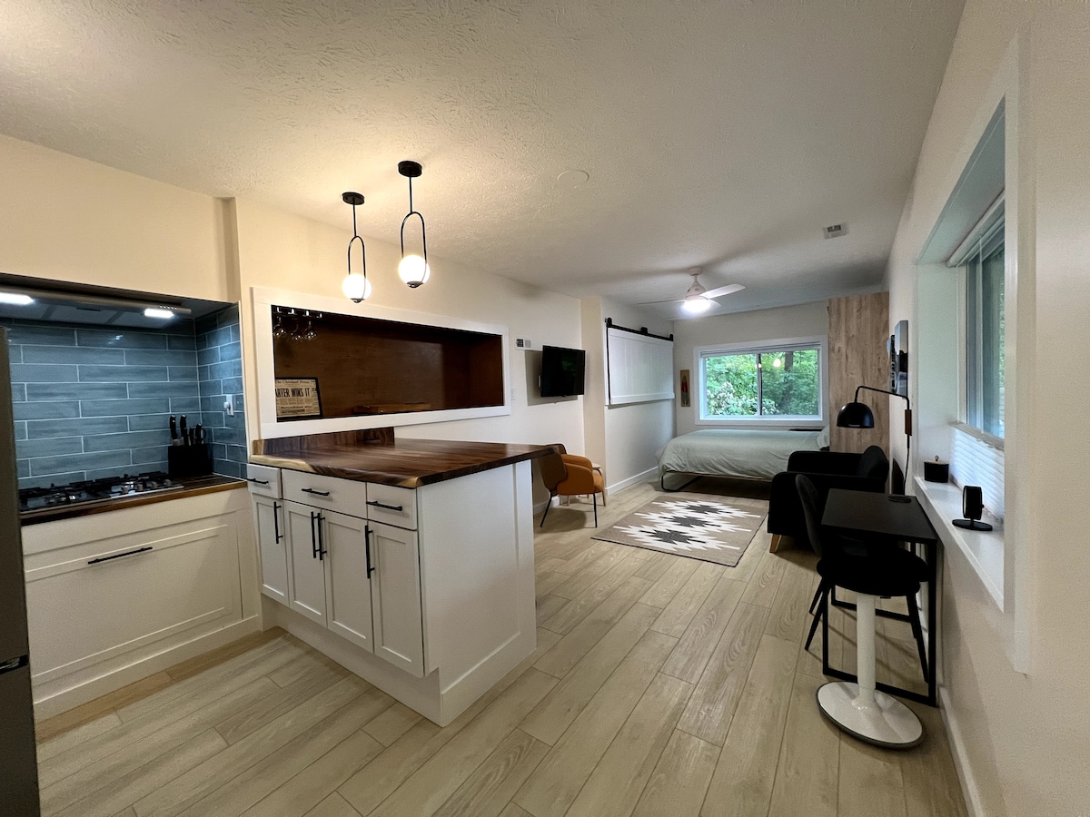 Immerse yourself in history at this renovated Chagrin Falls oasis! This apartment was originally built for secret service members as President Jimmy Carter's son once owned this home. This beautifully renovated studio apartment tucked away amongst the trees, boasts bright natural light , has a fully equipped kitchen, a convenient workspace, and a cozy murphy bed with queen mattress. Conveniently located, it's only a few minute walk to downtown Chagrin's charming shops, cafes and restaurants.