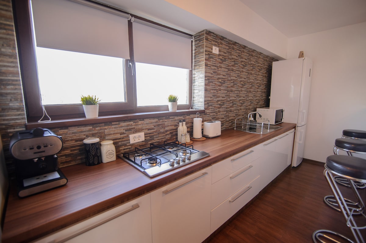 The apartment is located in the old city centre, within a 1 minute walk from the Constanta Casino and a 5 minutes walk from the bus stop or the Neversea Festival. The airport is 25 km away. Even if you arrive late, you will still be able to shop for whatever you need as there are a few stores opened 24/7. In 300 meters you will find all the seaside restaurants from Constanta Port or the pubs from Constanta Old City Centre. Nearby you can also find pharmacies, banks, pastry shops.