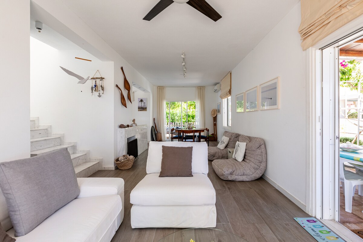 This is a sea view beach villa ideal for families, as well as a work from home place for long stays. It is situated in a lovely residential complex with a private road, ready to welcome guests from any nationality. Exactly in front of the complex there is a beautiful beach mainly used by the residents of the complex (Sirena Bay), making the use of a car unecessary. This makes it easy to swim as many times as you like throughout the day. It is also just 2km from the lovely Ayia Napa marina