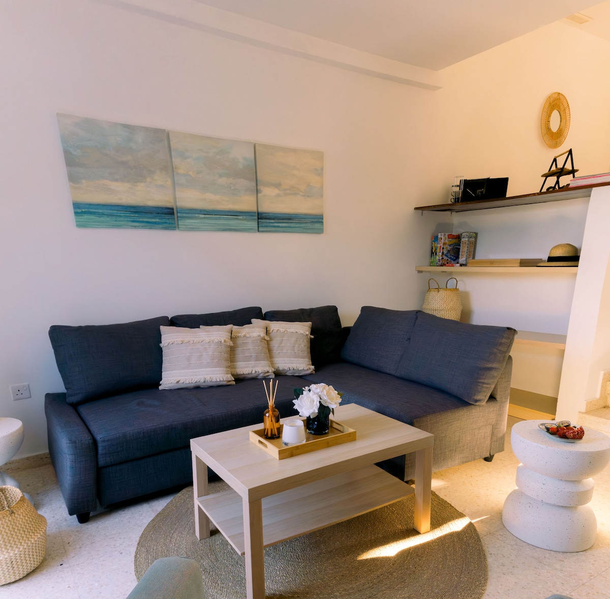 Just a 1-minute walk from the beach and only a 5–6 minute drive from Larnaca Airport, this peaceful two-bedroom home is part of a private seaside complex where most residents visit only on summer weekends — so it’s wonderfully quiet and relaxing all year round. While the complex feels tucked away, you’re just a short drive from some of the best local spots — from THETA Beach Bar at Faros Beach to Makenzy’s lively restaurants and beach clubs, water sports and ATV hires (15 min drive).