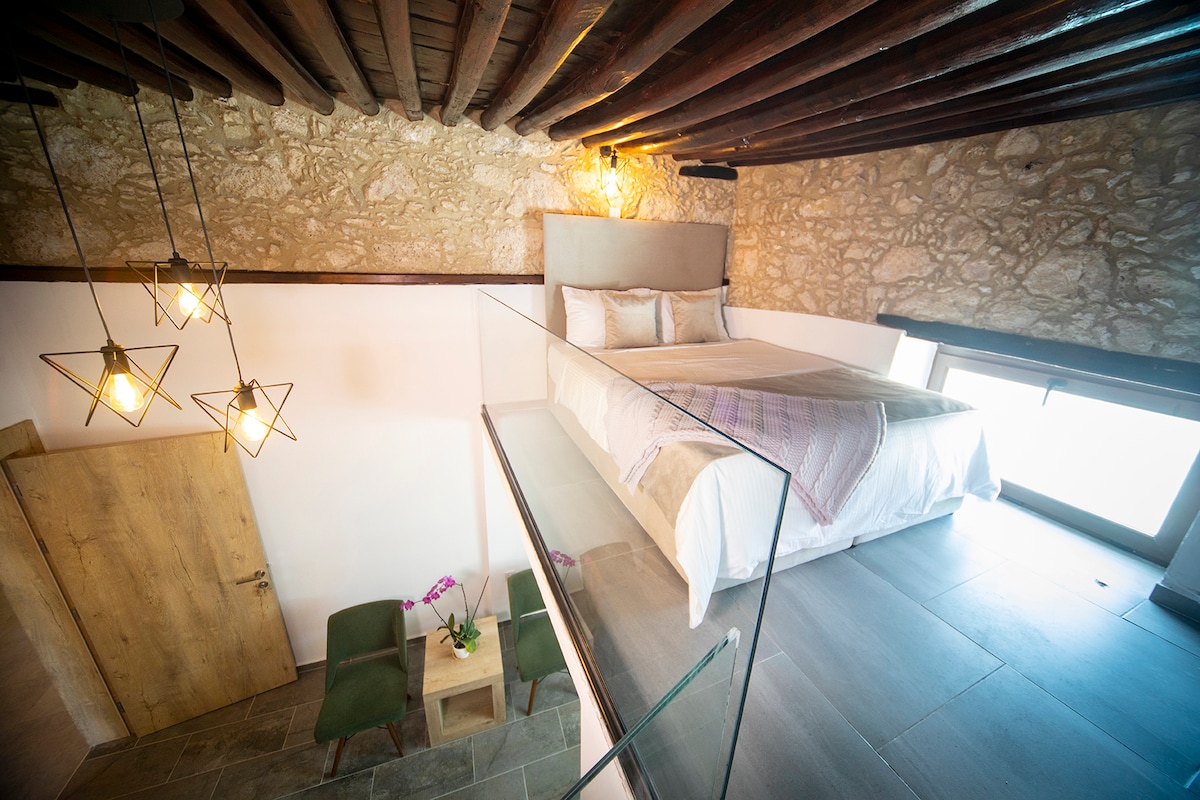 An elegantly furnished, modern style within a neoclassical restored building, offering a queen double bed, a bathroom with a fitted walk-in shower, one large window offering a private balcony overlooking the Holy Trinity Church, a private terrace offering a large bathtub, a bathroom with a shower, a refrigerator, tea & coffee making facilities, Smart TV offering Netflix, hairdryer, natural bath products by Olive Era, books and the finest pure white linen and towels.