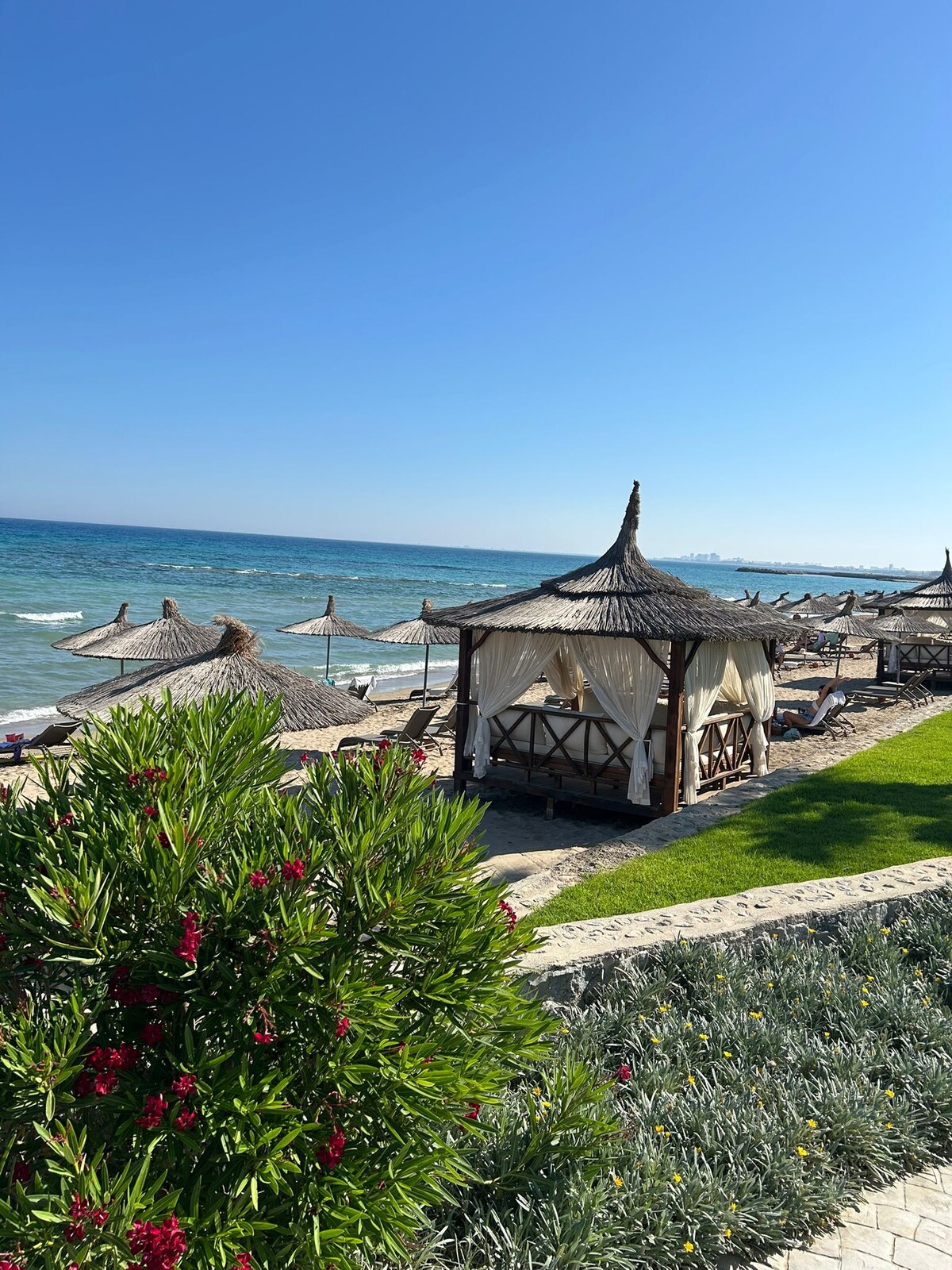 Enjoy your escape of the routine life in our new studio in Mykonos style with a lovely, small garden right beside a huge pool and a sandy beach offering the most stunning Cyprus sunset! You enter your studio through a separate entrance beside your private small garden (sitting area/BBQ). Enjoy a queen size bed & a cosy sofa or third bed, private bathroom, and a small kitchen & dining area. All shops & restaurants a few steps to walk. Harbour, mall & nightlife and more beaches 10 min by bus.