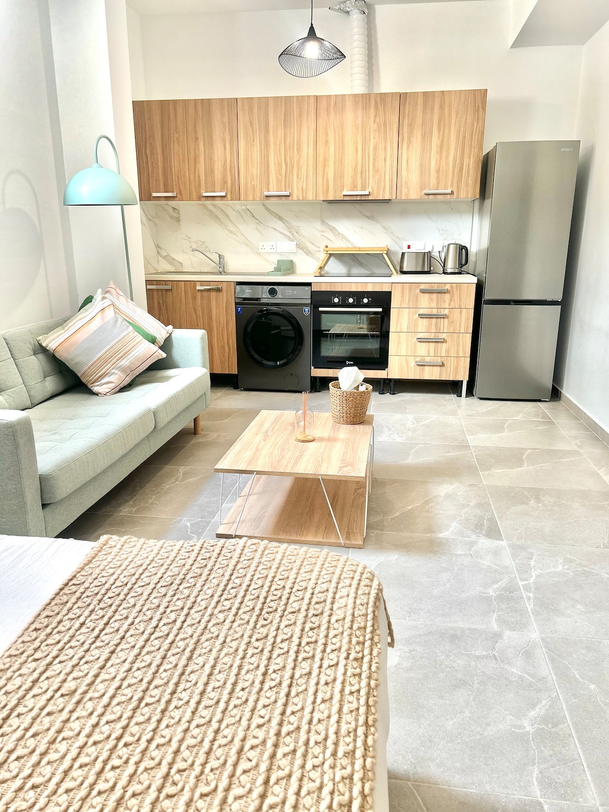 Kick back and relax in this calm, stylish space. Our sunny studio oasis is perfectly located in a quiet residential building in central Larnaca. Enjoy easy access to the Metropolis Mall and the beautiful Larnaca Finikoudes beach, just a 5 minute drive away. The airport is conveniently situated a short 12-minute drive from your doorstep. Our apartment is an ideal base for exploring all that Larnaca offers, with easy access to highways connecting you to Nicosia, Limassol, and Ayia Napa.