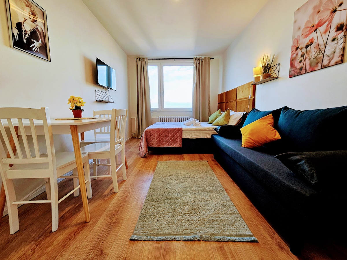 Modern, cozy and super clean studio apartment easily accessible to the Old Centre of Prague (15 minutes). Self-check in (from 5 p.m. or earlier based on request). WIFI (50 Mb/s), NETFLIX, coffee and tea for free. 5 minutes’ walk to tram station (then 15 minutes to the Old Centre). 10 minutes’ walk to metro station (then 4 minutes to the Old Centre). 1 double bad (200 cm x 160 cm), equipped kitchenette. 1 bathroom with shower corner, toilet,washing machine (hair dryer).