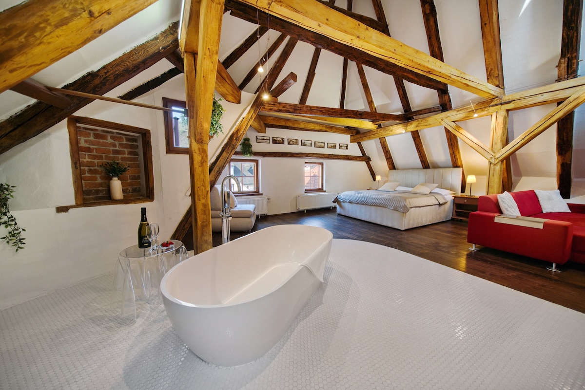The pride of our hotel Švamberský dům is the attic apartment with a bathtub located right in the middle of the room. In the generously designed spaces, you will be impressed by the original preserved medieval exposed and restored roof trusses. The suite has a spacious relaxation area with a television. The bathroom is equipped with a shower, a bathtub in the middle of the living room, a hair dryer and a separate toilet.